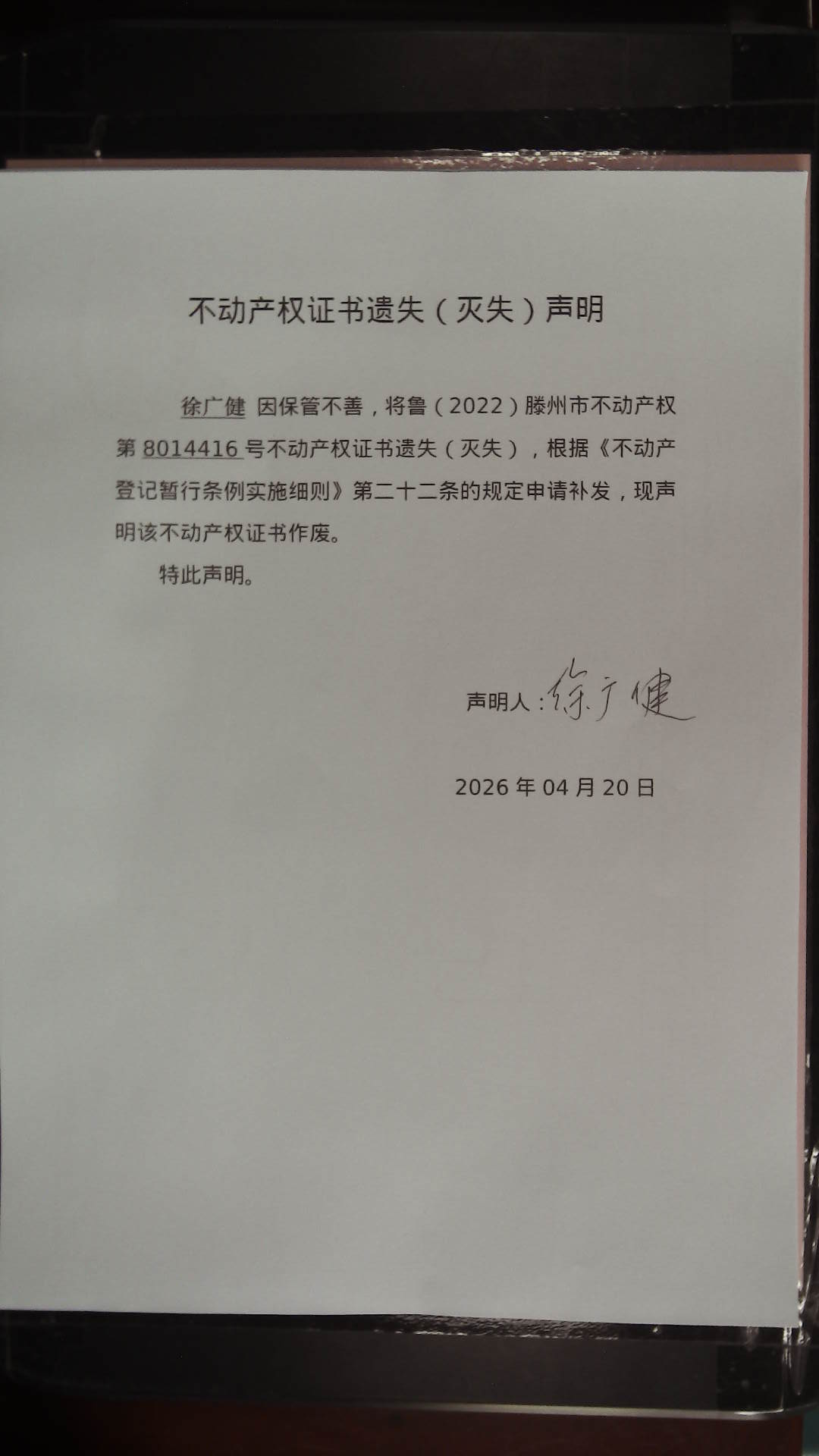 滕州市自然资源局不动产权证书遗失(灭失)声明