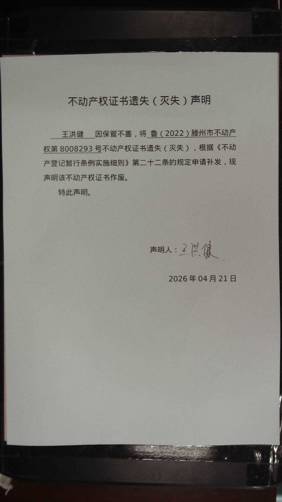 滕州市自然资源局不动产权证书遗失(灭失)声明