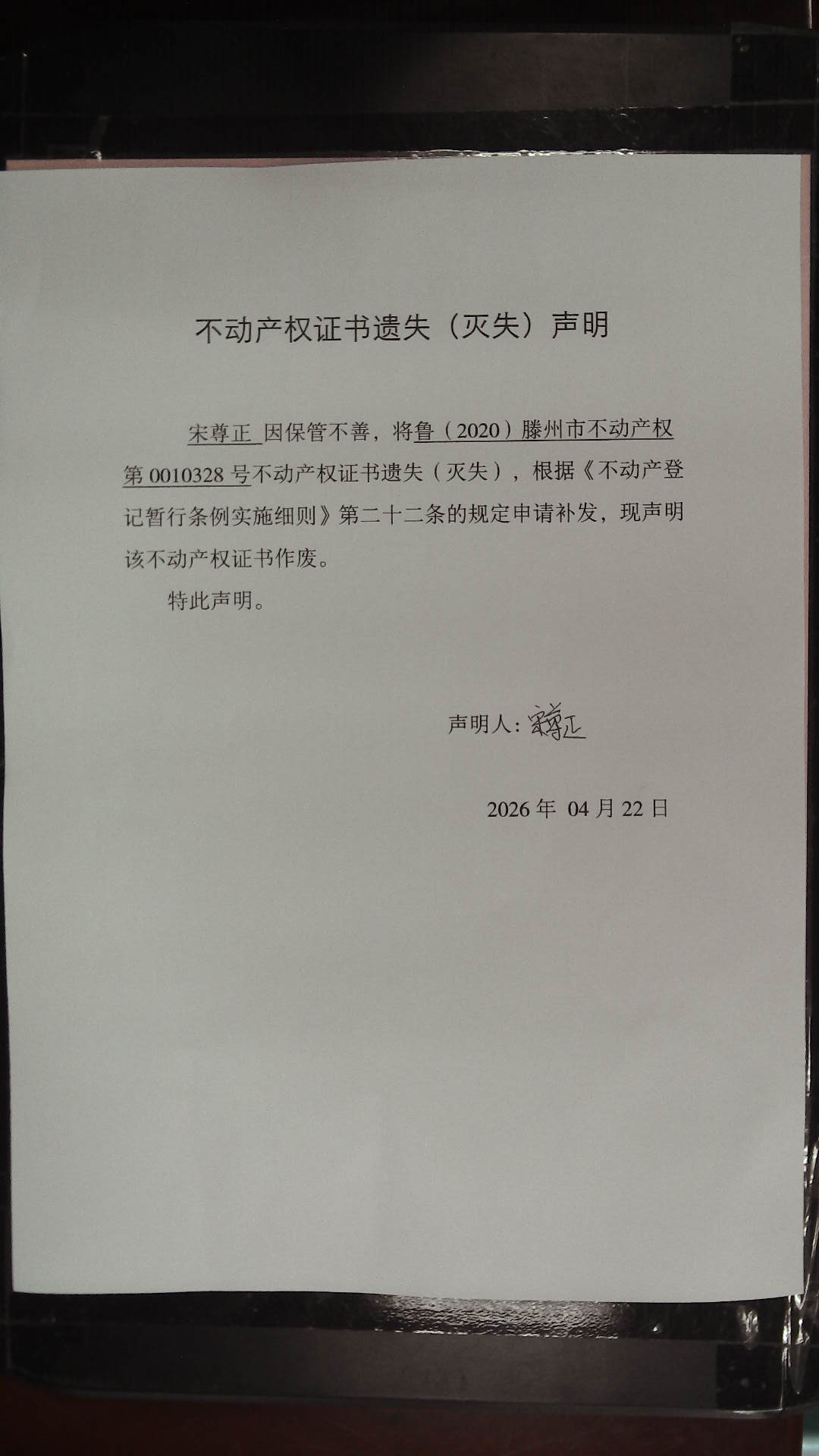 滕州市自然资源局不动产权证书遗失(灭失)声明