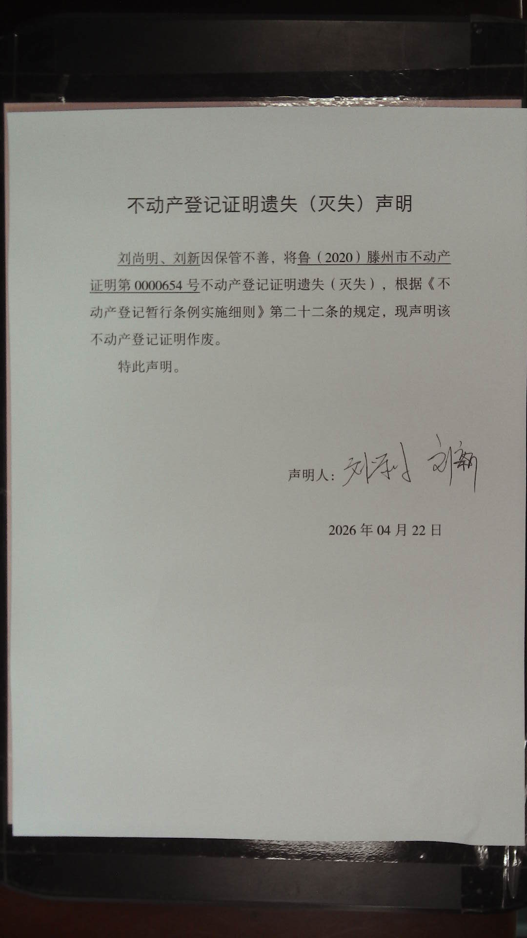 滕州市自然资源局不动产权证书遗失(灭失)声明