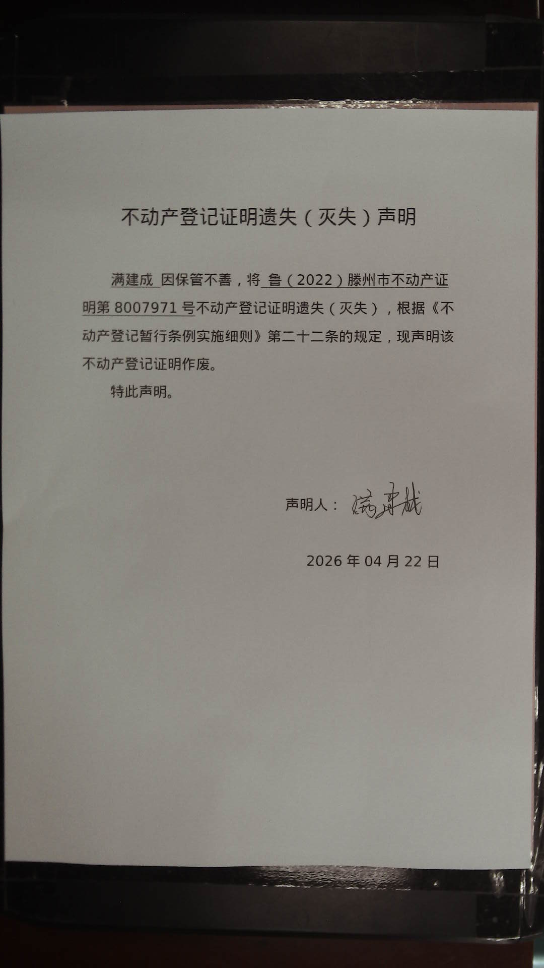 滕州市自然资源局不动产权证书遗失(灭失)声明