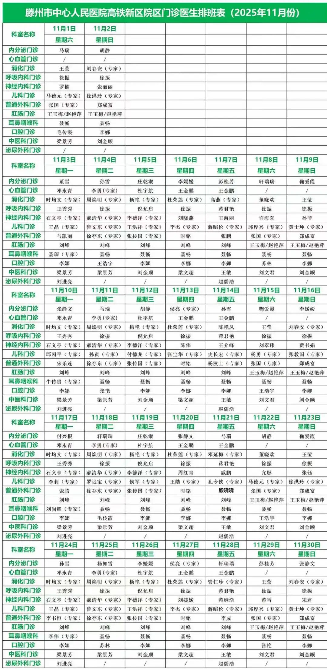 滕州市中心人民医院高铁新区院区2025年11月专家坐诊表