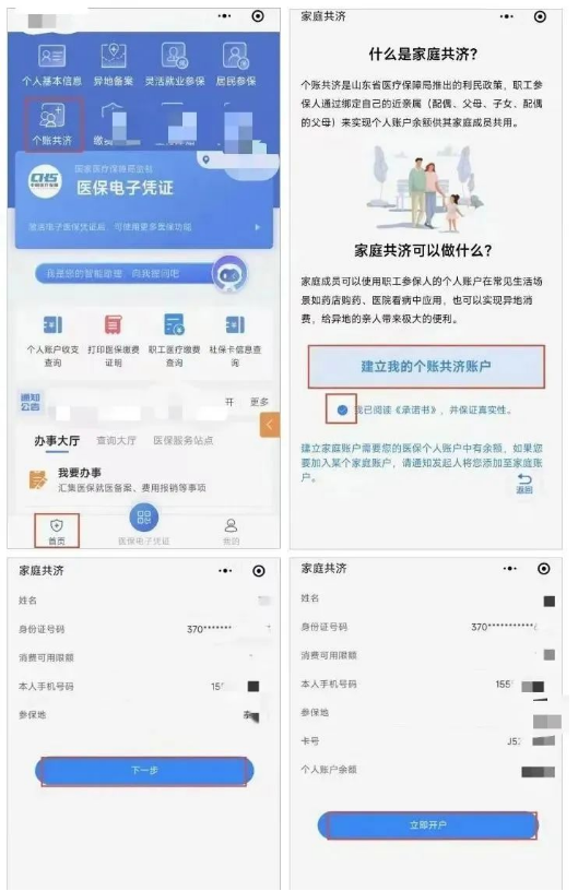 第二步:在首页业务办理操作界面下点击“个账共济”,阅读个账共济说明,勾选“我已阅读《承诺书》,并保证真实性。”后,点击“建立我的个账共济账户”,输入消费可用限额、本人手机号码,点击“下一步”,确认家庭共济相关信息后点击“立即开户”。