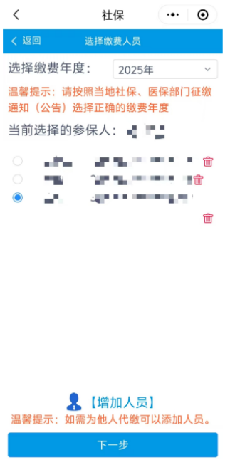 2.如未添加参保人或需要新增参保人,点击“增加人员”,输入相关信息增加需缴费的人员。选择缴费年度、需缴费的人员,点击“下一步”。