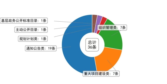全年共计在滕州市人民政府网站主动公开政府信息数36条。其中,重大项目建设类7条,占总数的19.4%;通知公告类19条,占总数的52.8%;规划计划类1条,占总数的2.8%;组织管理类7条,占总数的19.4%;主动公开目录1条,占总数的2.8%;基层政务公开标准目录1条,占总数的2.8%。