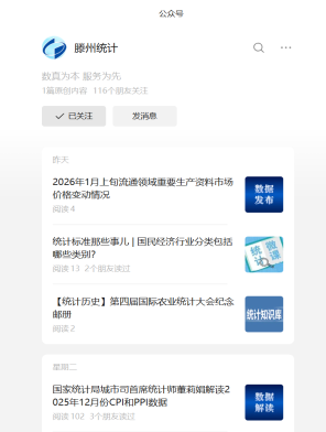不断拓宽公开渠道、创新公开方式、丰富公开载体,综合利用滕州市人民政府官网“本市动态”栏目“滕州市统计局”页面、滕州市人民政府官网信息公开页面、“滕州统计”微信公众号等渠道发布政务公开信息。明确专人维护信息公开平台,丰富信息公开内容,加大信息公开频率。举办“中国统计开放日”“统计法颁布纪念日”等活动,积极展现我市经济社会发展成果。截至2025年12月31日,“滕州统计”微信公众号关注人数已近1800人。