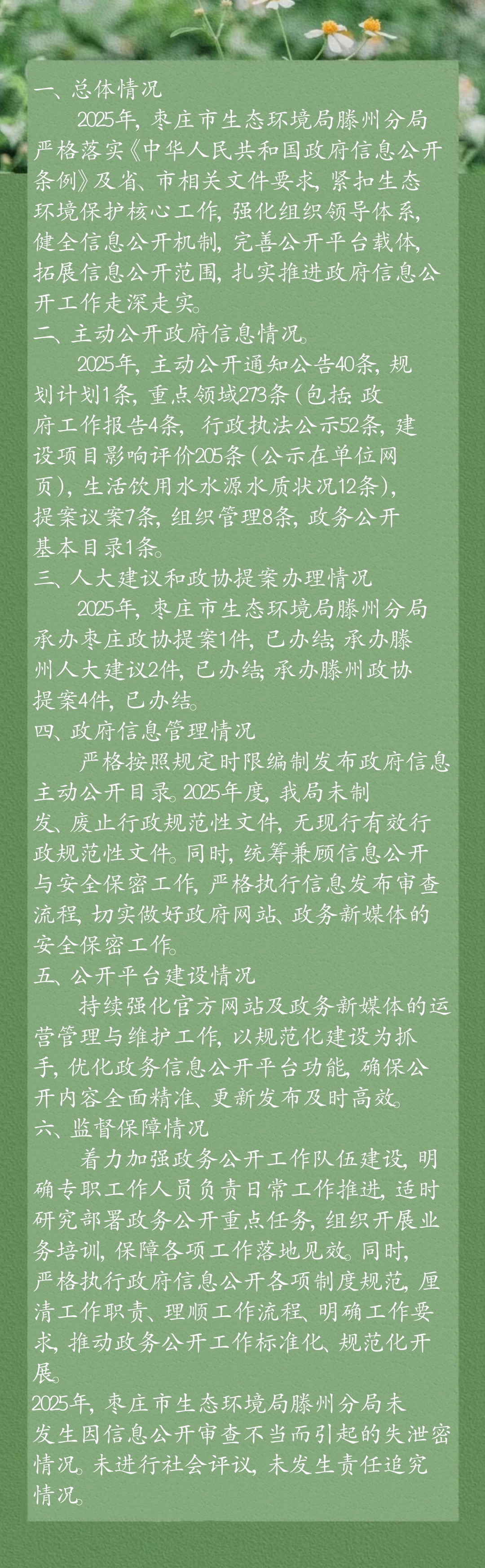 枣庄市生态环境局滕州分局2025年政府信息公开工作年度报告根据《中华人民共和国政府信息公开条例》和《中华人民共和国政府信息公开工作年度报告格式》(国办公开办函〔2021〕30号)编制。本报告主要包括主动公开、依申请公开、政府信息管理、政府信息公开平台建设、监督保障等方面内容。本报告中所列数据的统计期限自2025年1月1日起至2025年12月31日止。