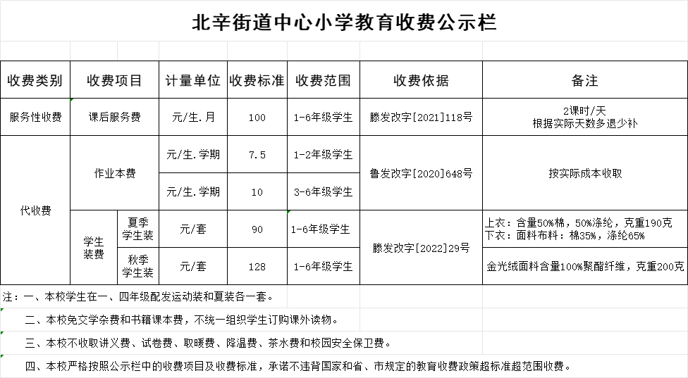 (收费信息)北辛街道中心小学2025年度收费信息