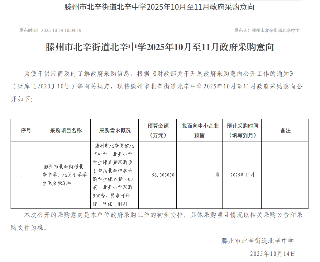 (采购信息)滕州市北辛街道北辛中学2025年10月至11月政府采购意向