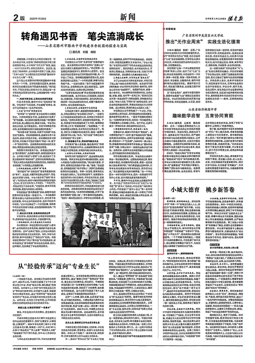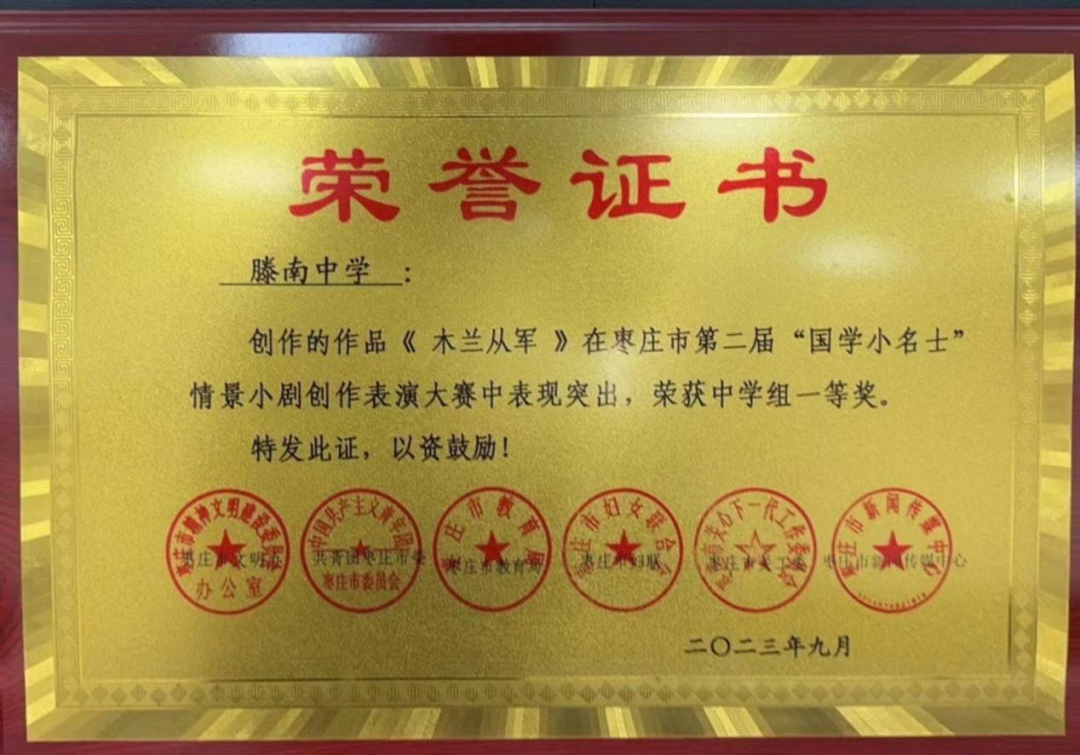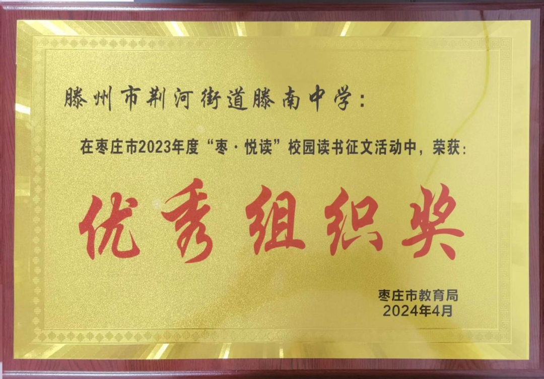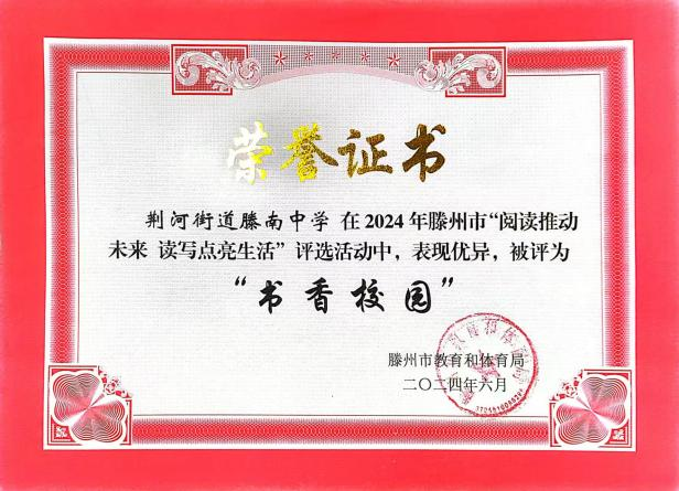 我校书香校园建设成果斐然,相关经验《转角遇见书香 笔尖流淌成长——山东省滕州市滕南中学构建书香校园的探索与实践》已刊发于全国性德育权威媒体《德育报》,建设经验向全国推广;先后斩获山东省 “星火阅读” 优秀组织奖、枣庄市 “枣・悦读” 优秀组织奖等多项荣誉,千余名师生在国家、省、市级读写赛事中摘金夺银,南风文学社获评市级优秀社团,读写育人成效获得社会各界广泛认可。
