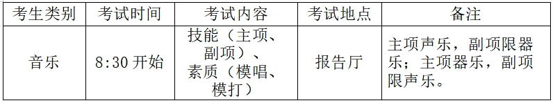 说明:1.不得使用通俗唱法;2.架子鼓、葫芦丝、巴乌、吉他、电吉他、电贝司、电子琴、口琴等不能作为主项或副项;3.钢琴外,其它自备;4.开考前10分钟考生到场检录。