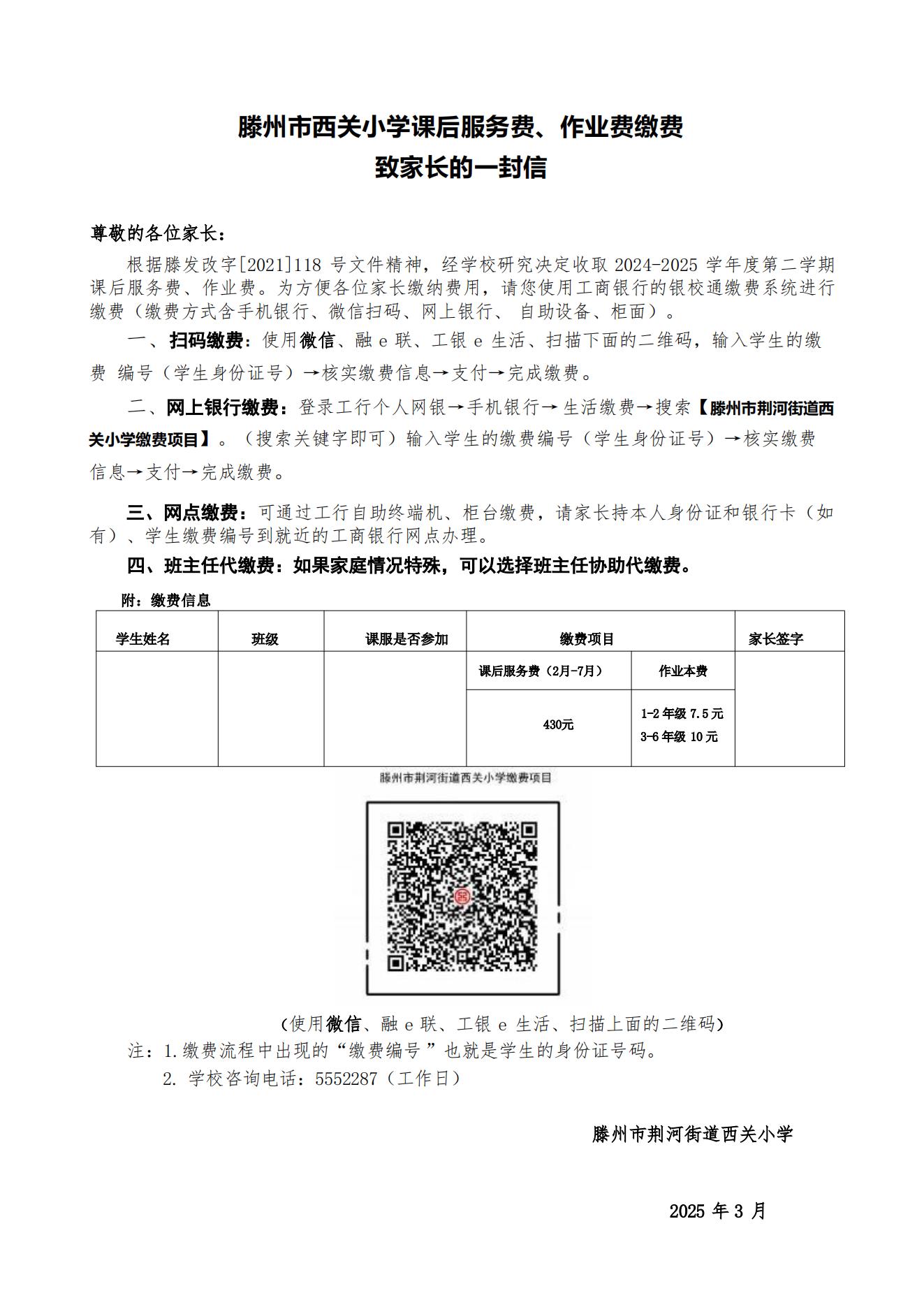 (收费信息)西关小学2025年春季代收费致家长一封信