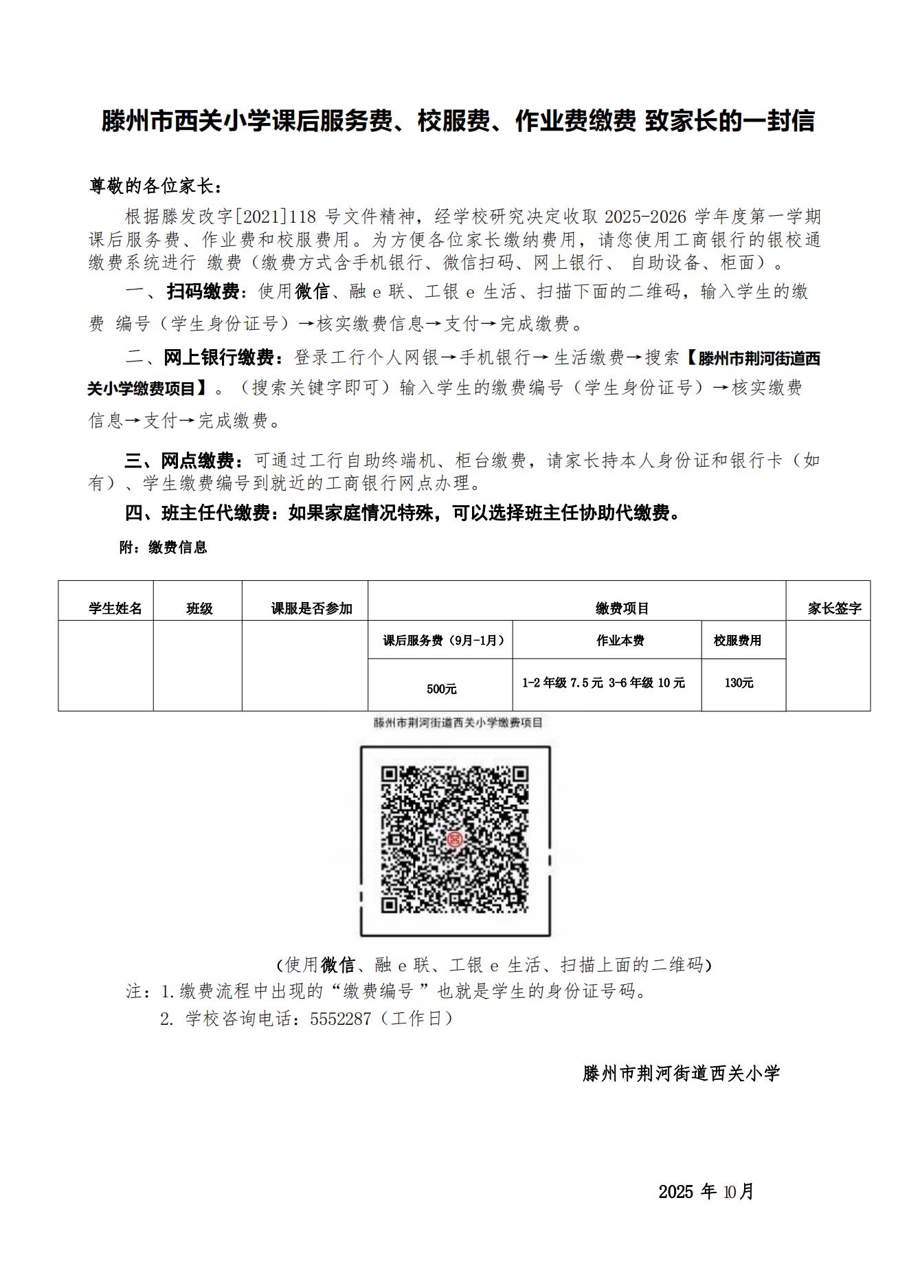 (收费信息)西关小学2025年秋季代收费致家长一封信