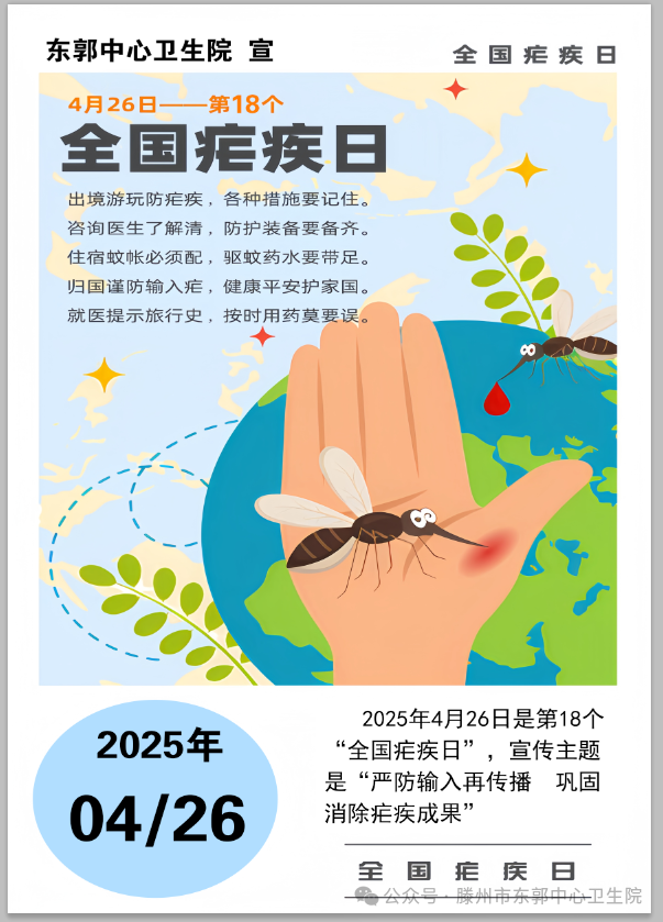 2025年4月26日是第18个“全国疟疾日”,为提高群众对于疟疾防控意义的重视,4月21日,滕州市东郭中心卫生院联合东郭镇新时代文明实践所、滕州市东郭镇社区社会组织联合会在东郭镇后村社区开展以“严防输入再传播,巩固消除疟疾成果”为主题的系列宣传咨询志愿服务活动。