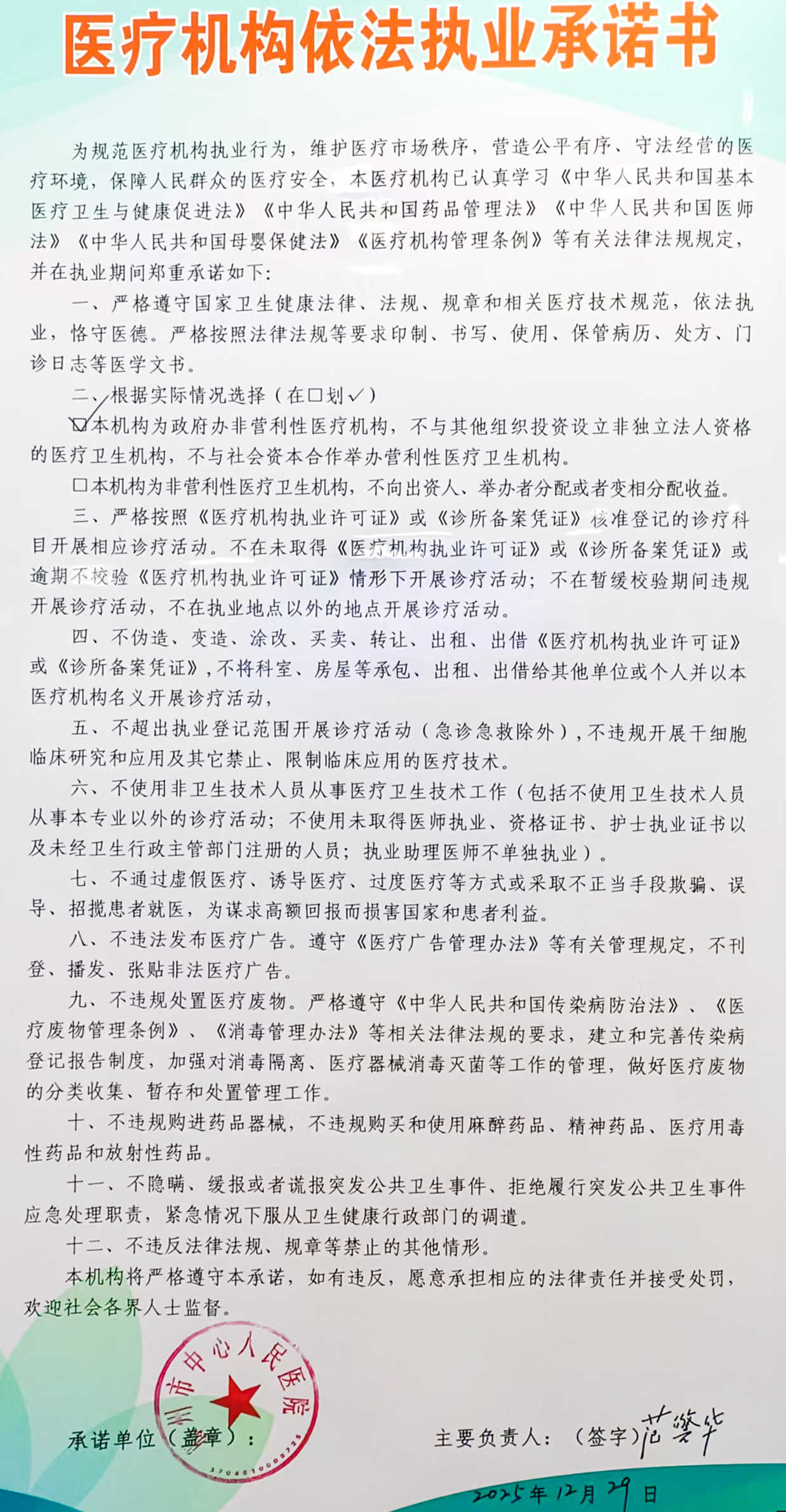 (行风建设)滕州市中心人民医院《医疗机构依执业承诺书》