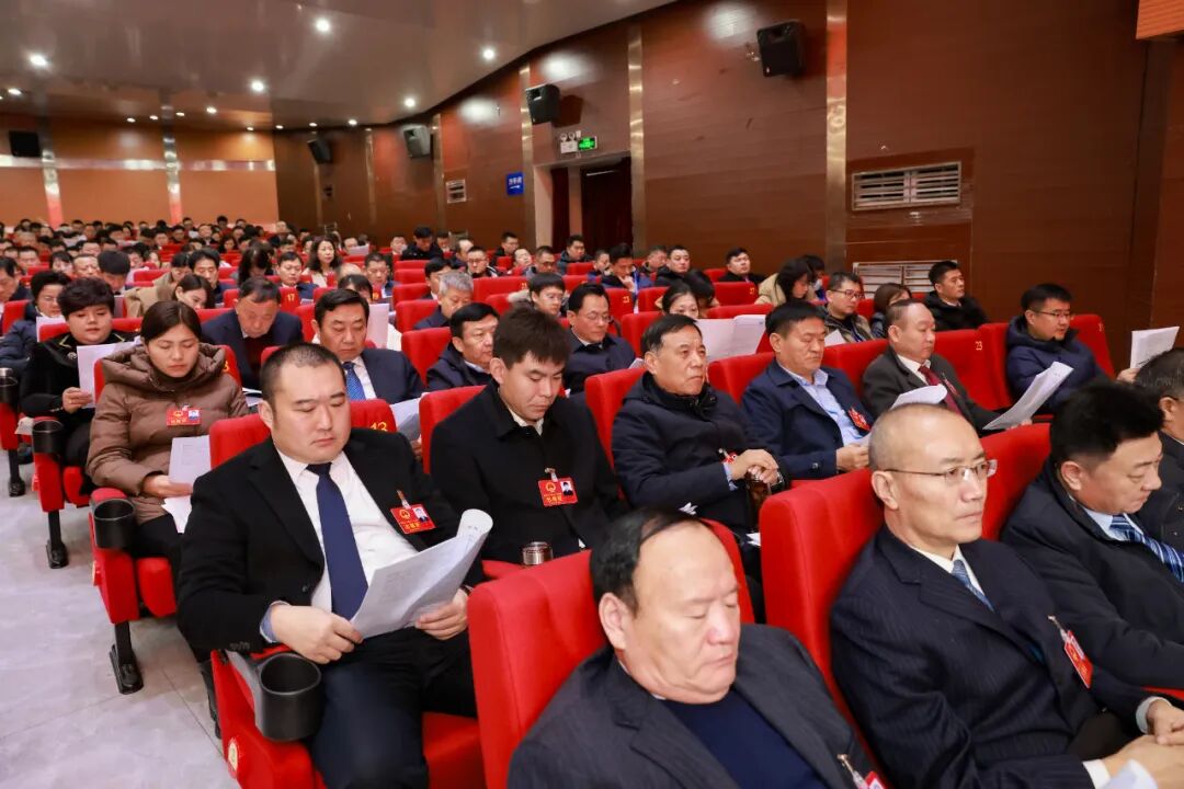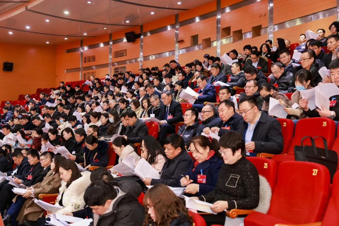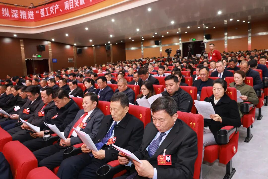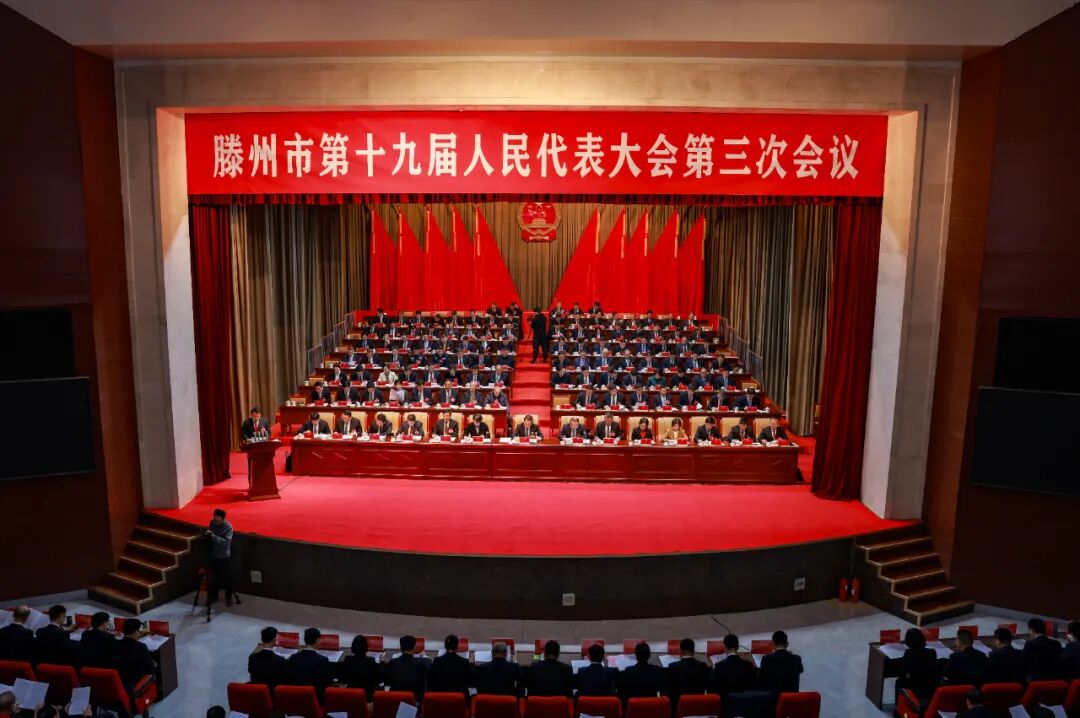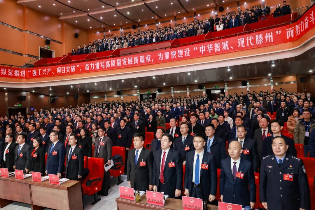 滕州剧院会场内气氛隆重热烈,主席台帷幕正中的国徽在鲜艳的红旗映衬下熠熠生辉。二楼眺台上,“纵深推进‘强工兴产、项目突破’,奋力谱写高质量发展新篇章,为加快建设‘中华善城、现代滕州’而努力奋斗!”的巨幅标语,格外引人注目。