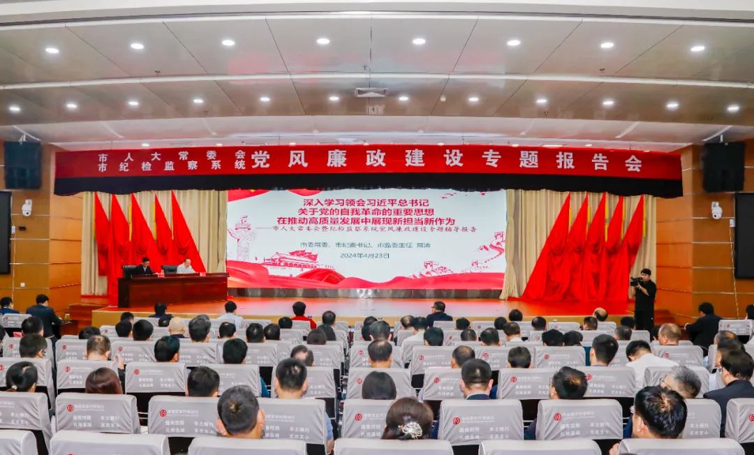4月23日,市人大常委会和市纪委监委联合举办党风廉政建设专题报告会,纵深推进党纪学习教育,进一步推动人大监督与纪检监察监督贯通协调。市人大常委会党组书记、主任朱晏辰主持会议并讲专题党课。市委常委、市纪委书记、市监委主任常涛作党风廉政建设专题辅导报告。市人大常委会领导班子成员、市人大机关全体人员、市纪委监委机关部分领导干部,各镇街人大、纪(工)委负责人参加报告会。