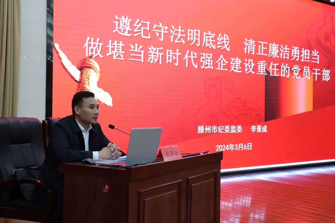此次培训特邀滕州市纪委监委派驻第八纪检监察组组长李景成进行专题授课。培训中,李景成以《遵纪守法明底线,清正廉洁勇担当—— 做堪当新时代强企建设重任的党员干部》为题,从明底线,知戒惧,敢担当三个方面,以专业理论和生动案例相结合的方式,为大家做了精彩的授课。