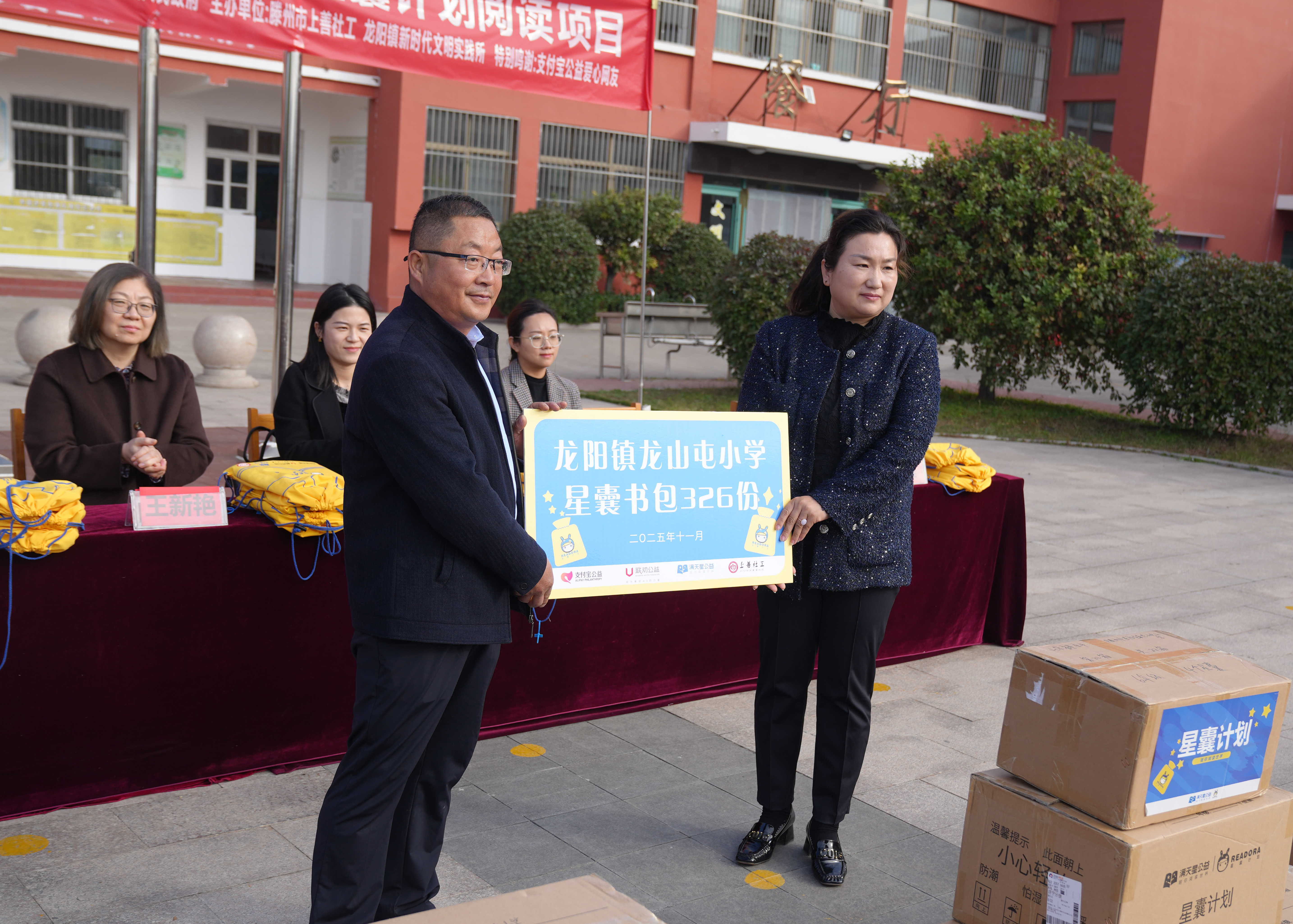仪式现场举行了简朴而隆重的图书捐赠环节。326套涵盖文学、科普、历史等多领域的优质图书正式捐赠给龙山屯小学。这批图书将采取“图书漂流”的创新方式,供全校学生循环阅读,促进知识在孩子们之间流动,有效拓宽他们的阅读视野,最大化发挥每一本书的价值。