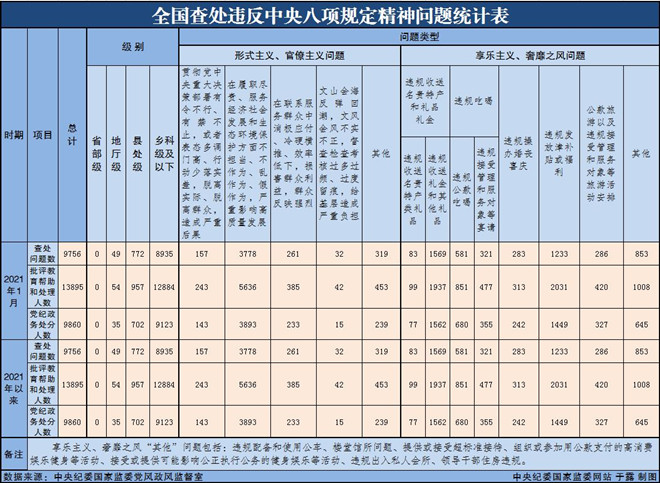 为掌握全国贯彻落实中央八项规定精神情况,中央纪委国家监委在各省区市和新疆生产建设兵团、各中央和国家机关、各中央企业和中央金融企业等建立了落实中央八项规定精神情况月报制度。2021年以来,截至1月31日,全国查处违反中央八项规定精神问题情况如下: