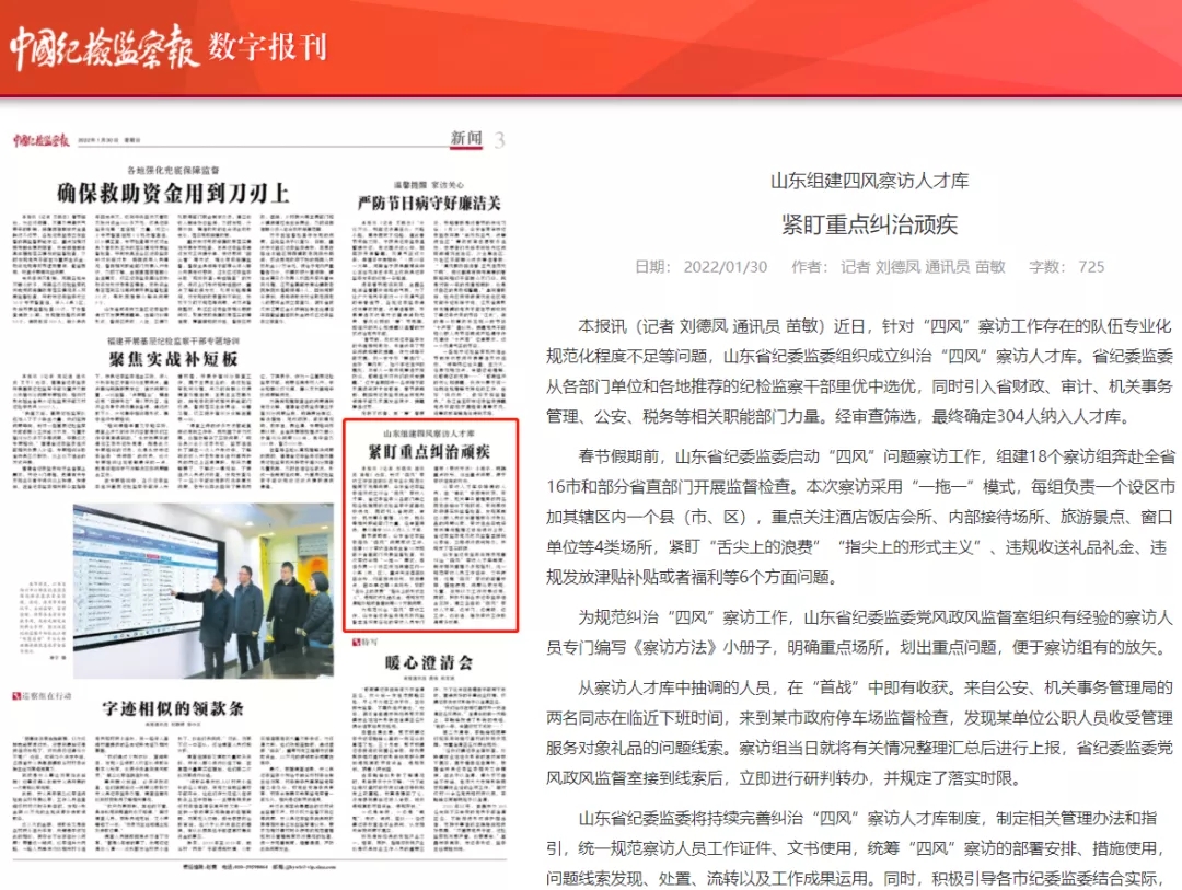 1月30日,《中国纪检监察报》刊发文章:《山东组建四风察访人才库 紧盯重点纠治顽疾》。全文如下: