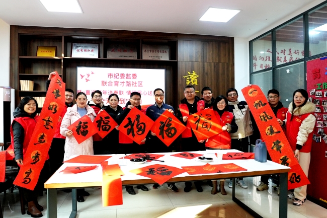 市纪委监委机关联合育才路社区开展党建结对共建,举办“喜迎新年送春联·情暖民心送祝福”志愿服务活动。活动现场,纪检监察干部和社区书法爱好者挥毫泼墨,书写廉洁春联和福字,赠送给社区商户和居民。孙艳敏 摄