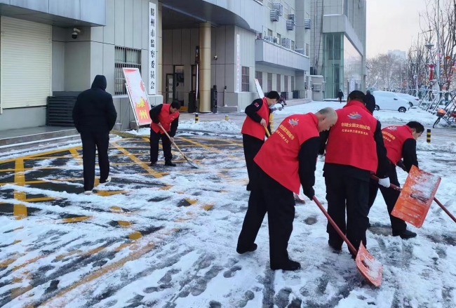 为减少雨雪天气对居民生活、出行造成的影响,市纪委监委机关组织党员志愿者清扫单位周边主干道、辅道区域积雪,为广大群众营造安全整洁的出行环境。张炎炎 摄