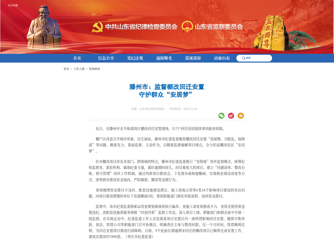 山东省纪委监委网站 | 滕州市:监督棚改回迁安置 守护群众“安居梦”