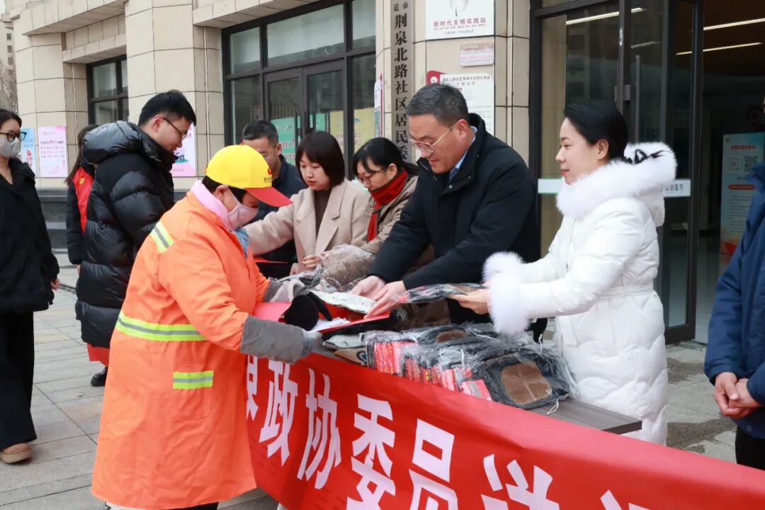 活动组一行来到荆泉北路社区工会户外劳动者服务站点,向外卖小哥、环卫工人、社区工作者等户外劳动者送去了春联、手套、耳罩、护膝等暖冬物品,并向他们致以新春问候和美好祝福,让他们感受到关心关爱,彰显了政协委员奉献社会的责任担当。