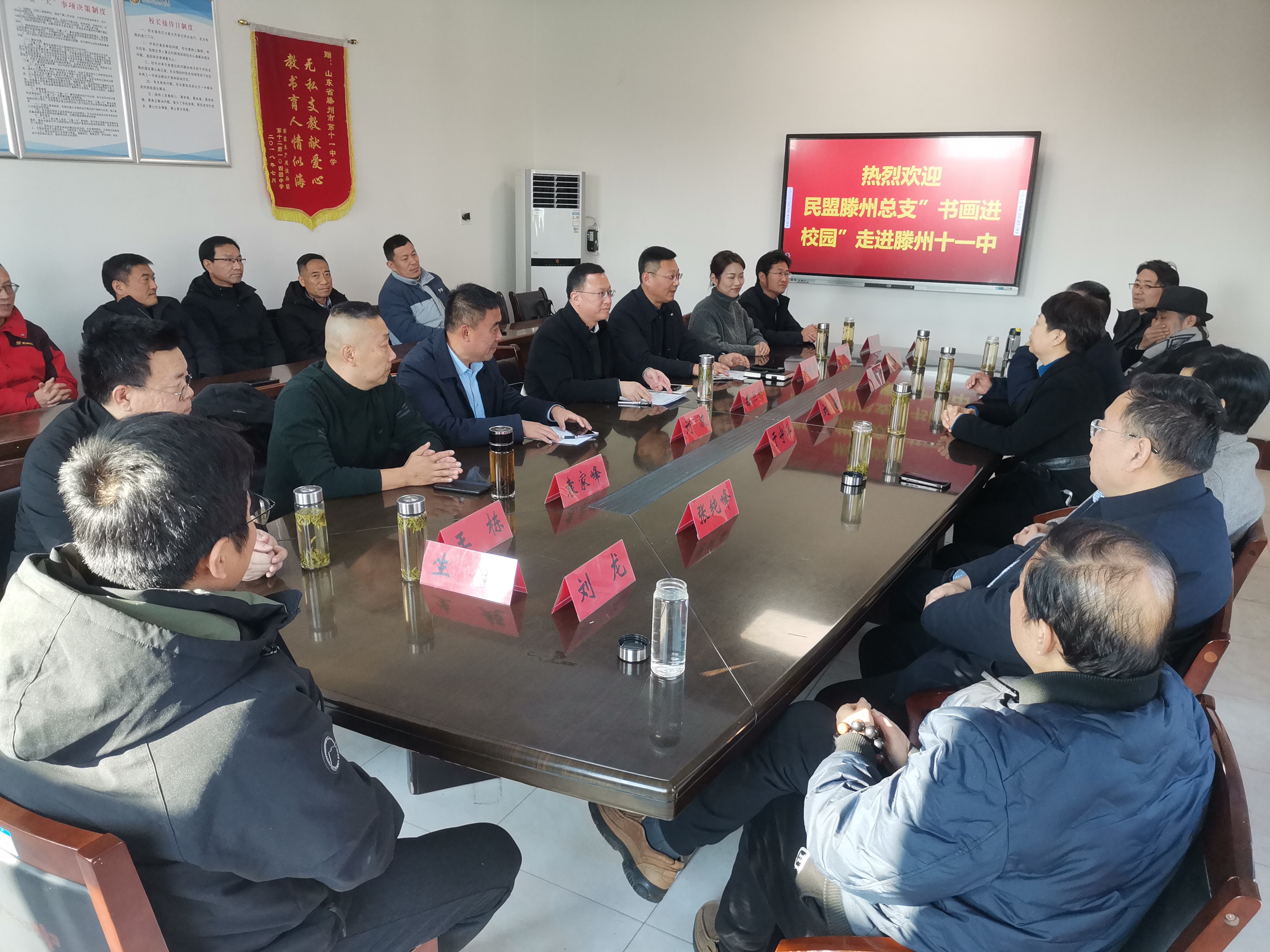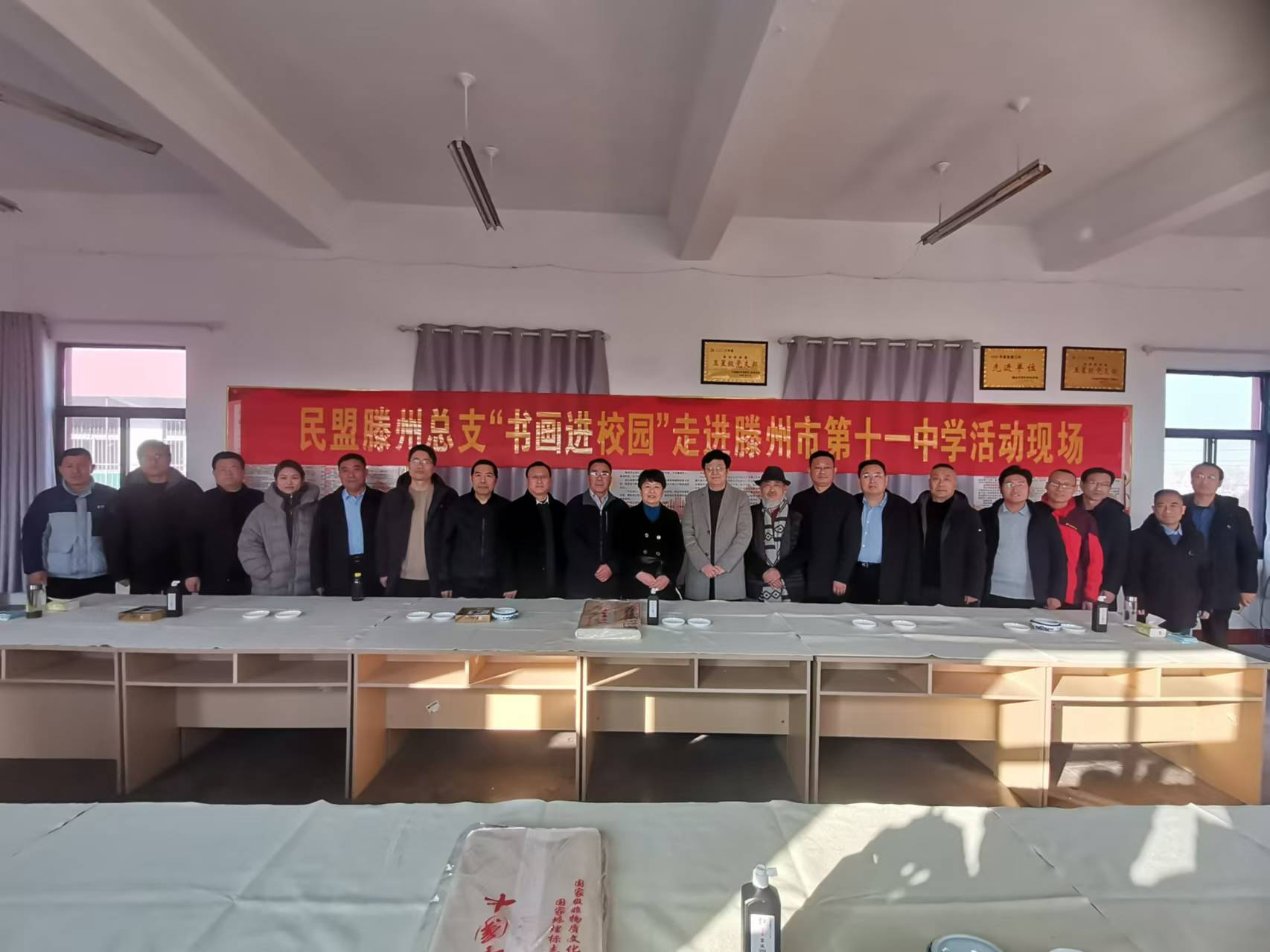 12月23日下午,市政协民盟届组织政协委员及书画院十余名书画家走进滕州市第十一中学开展书画进校园活动。