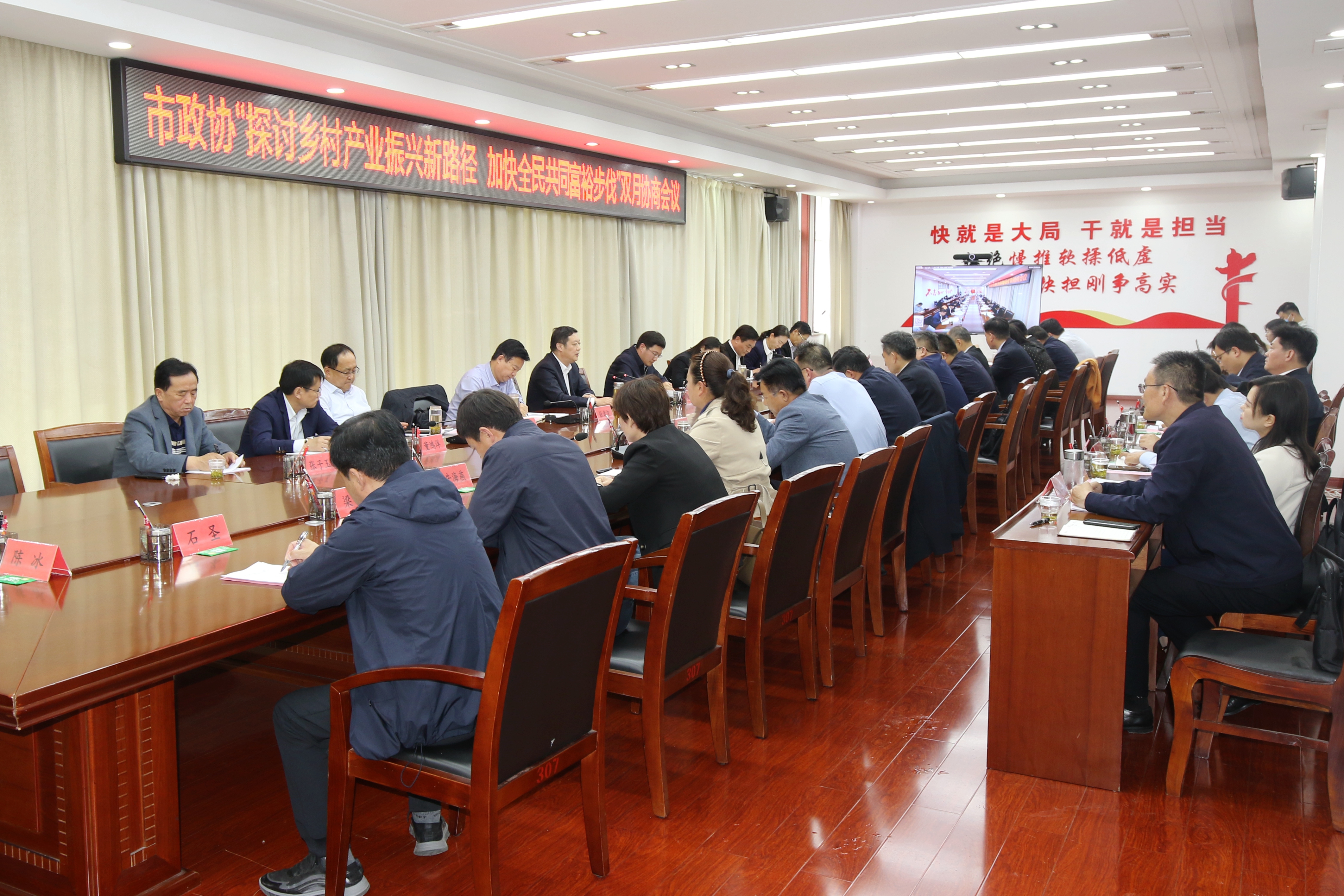 5月5日,市政协组织开展“探讨乡村产业振兴新路径 加快全民共同富裕步伐”双月协商活动。市政协主席薛登峰,副市长樊晓阳,副主席杜孝玺、乔令梅、邢孟航、黄玉传、董鸿洋、单金凤,市政协党组成员张子玉,市政协秘书长秦修杭出席活动。市委组织部、市大数据局、市城乡水务局、市农业农村局(市乡村振兴局)、市文化和旅游局、市金融服务中心、市供销社等有关部门负责同志,部分政协常委、委员,部分镇街党委副书记、政协委员联络室主任参加活动。