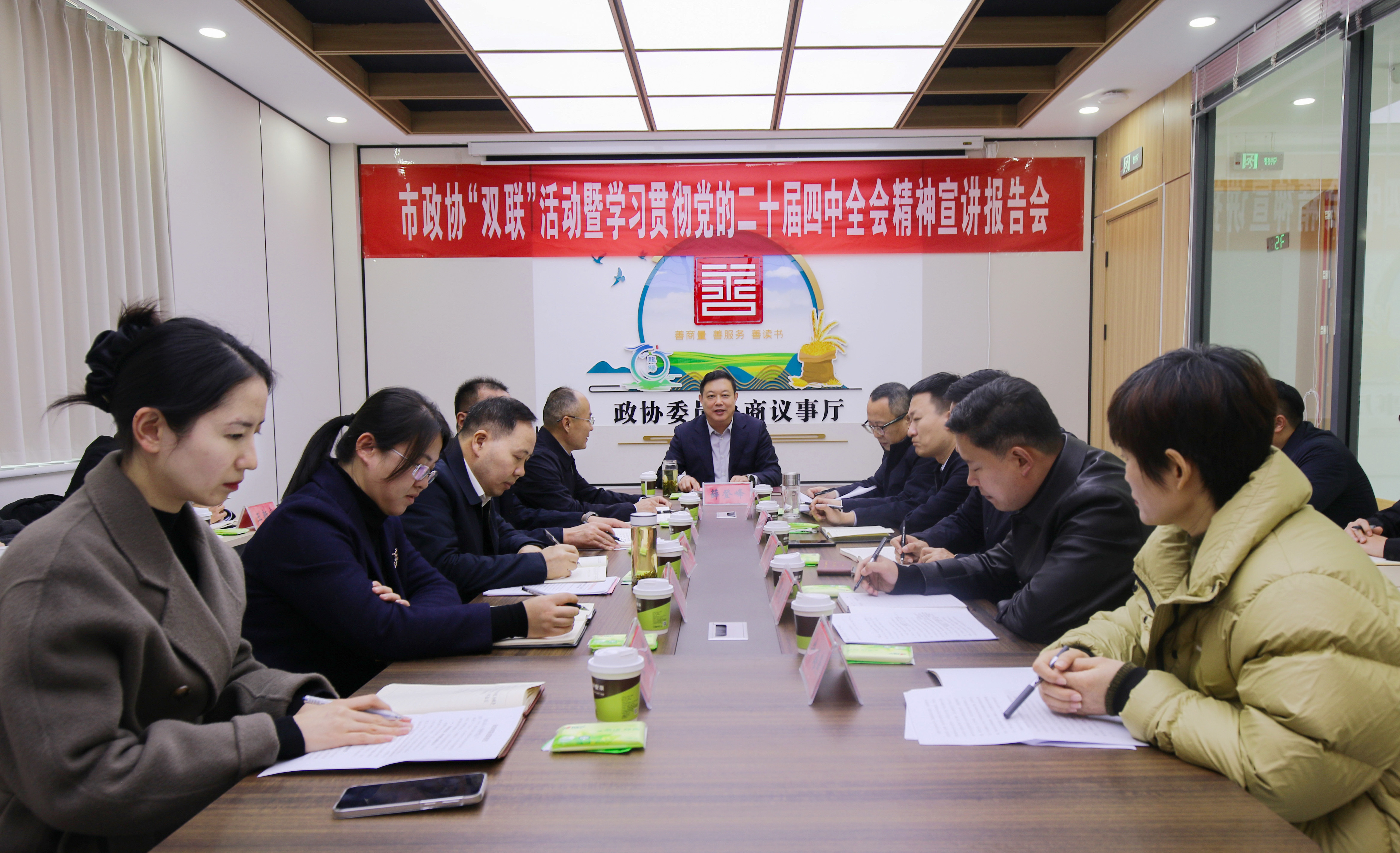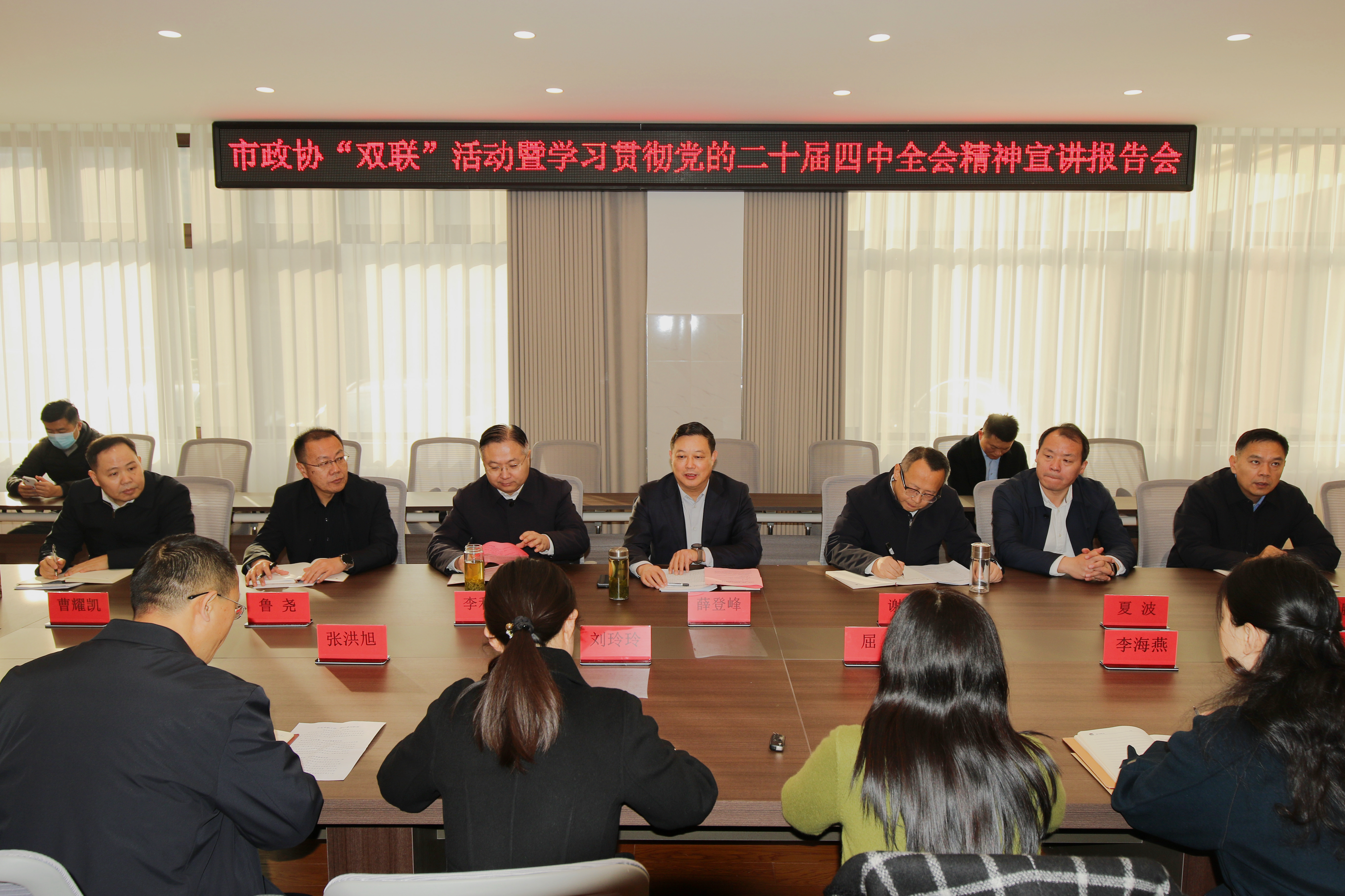 12月9日,市政协党组书记、主席薛登峰深入教育界、农业界政协委员协商议事厅开展“双联”活动,与委员面对面座谈交流,并专题宣讲党的二十届四中全会精神。市政协党组成员、秘书长谢经雷,机关相关委室负责人,相关界别政协常委、委员以及市直有关部门、镇街负责同志参加活动。