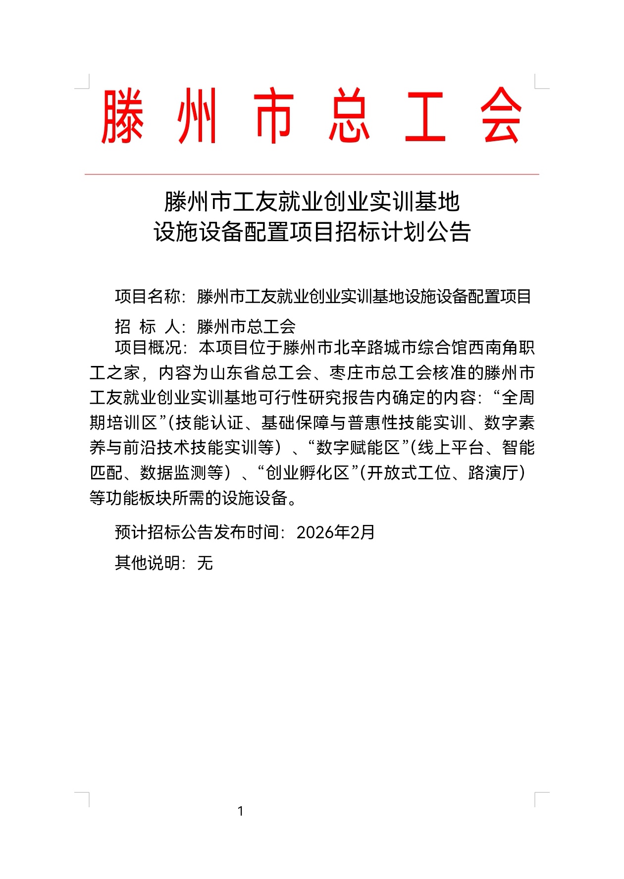 滕州市工友就业创业实训基地设施设备配置项目招标计划公告