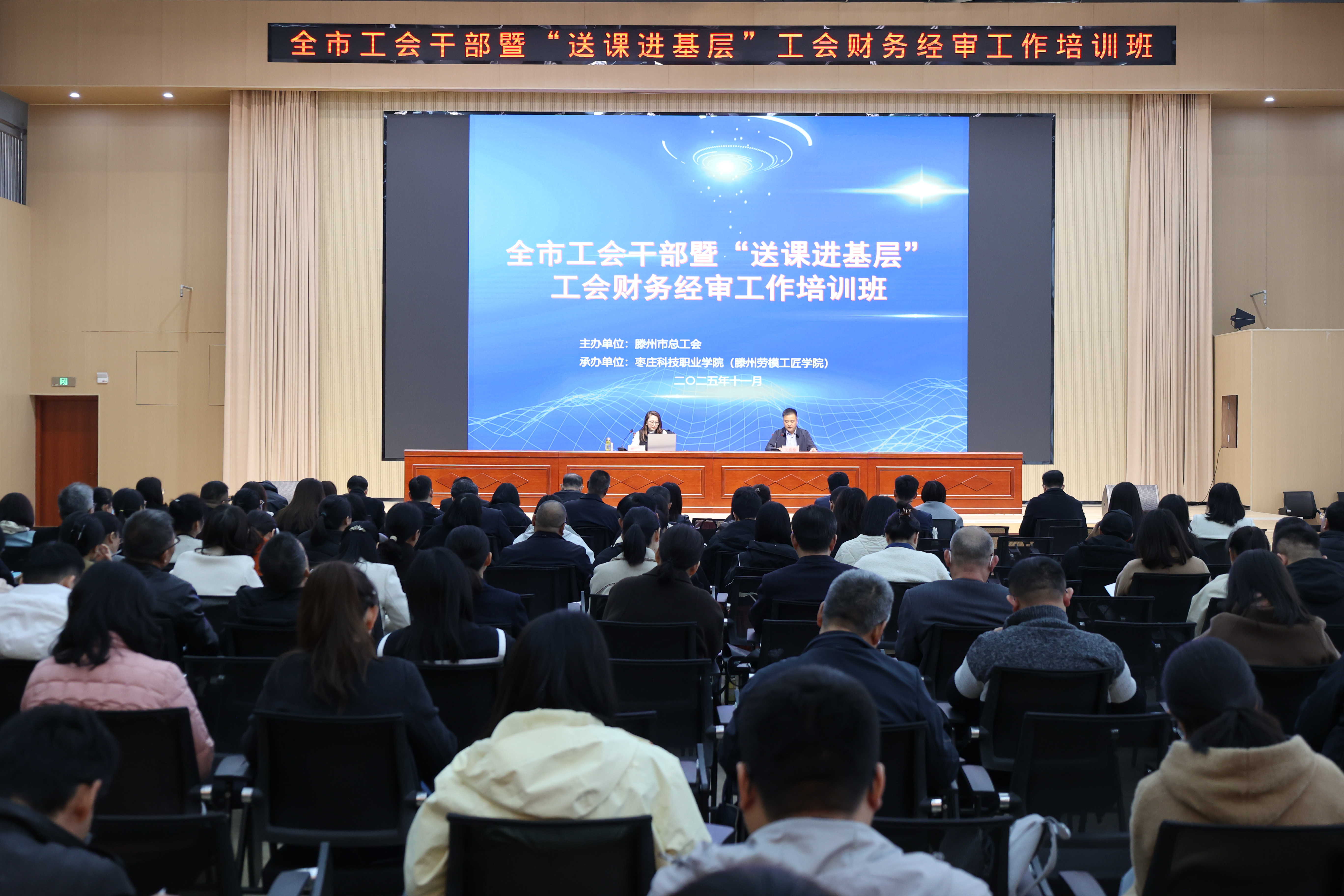 为进一步加强我市基层工会干部队伍建设,提升基层工会干部理论素养和业务能力,11月13日全市工会干部暨“送课进基层”工会财务经审工作培训班在枣庄科技职业学院成功举办,来自全市工会系统170余名工会干部参加培训。