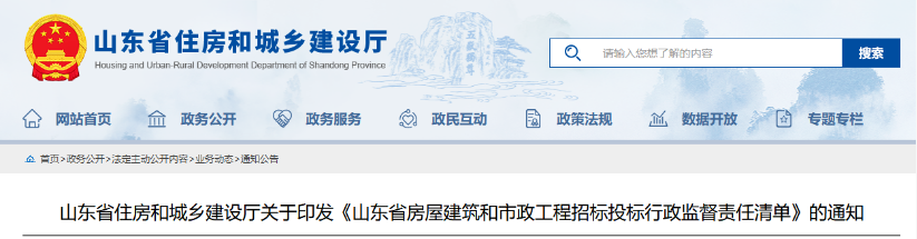 山东省住房和城乡建设厅关于印发《山东省房屋建筑和市政工程招标投标行政监督责任清单》的通知