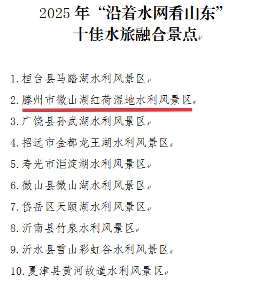 近日,山东省水利厅、文化和旅游厅、山东黄河河务局联合发布2025年“沿着水网看山东”十佳水旅融合景点名单,我市微山湖红荷湿地水利风景区成功入选,成为全省水旅融合发展标杆。