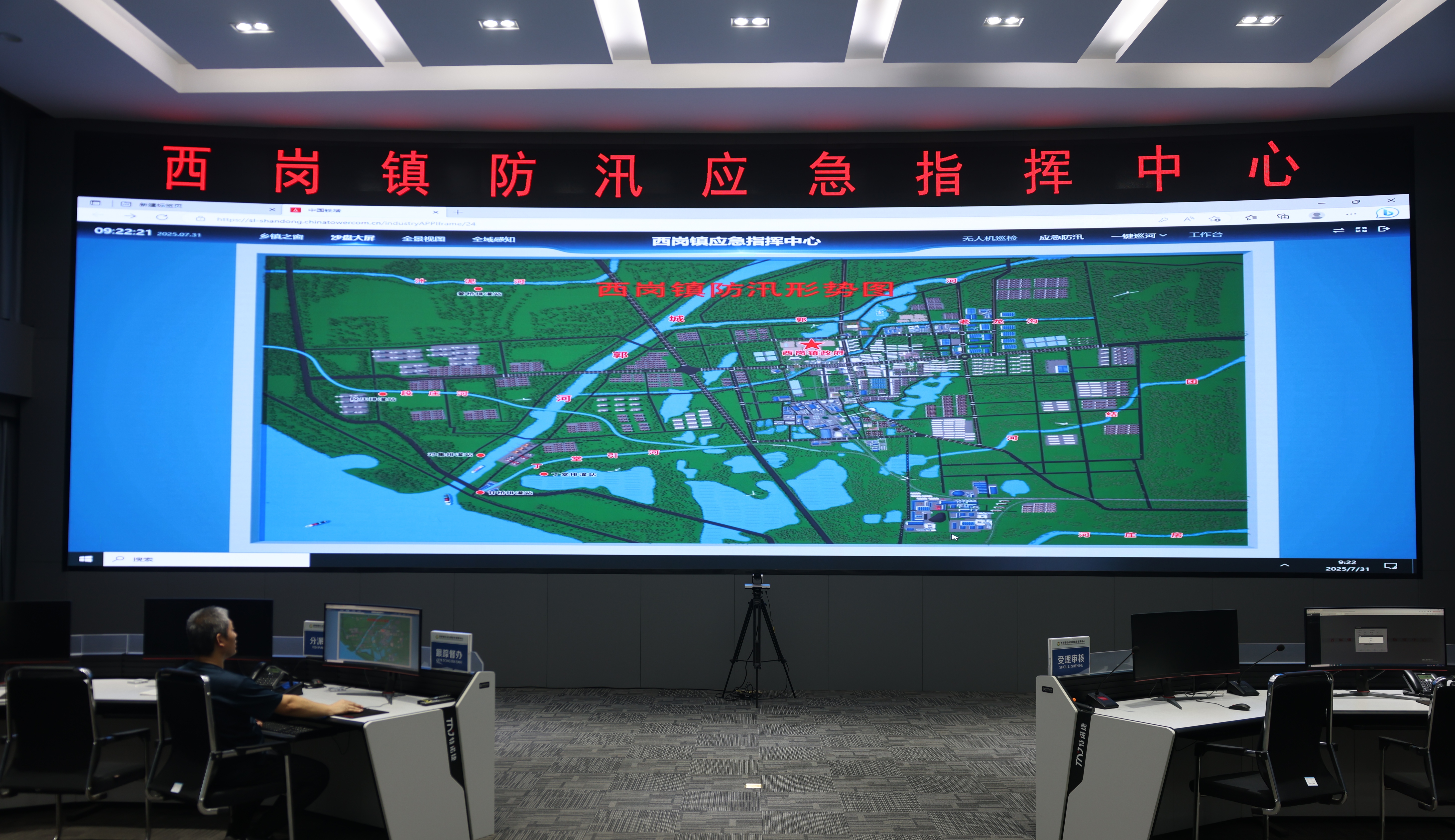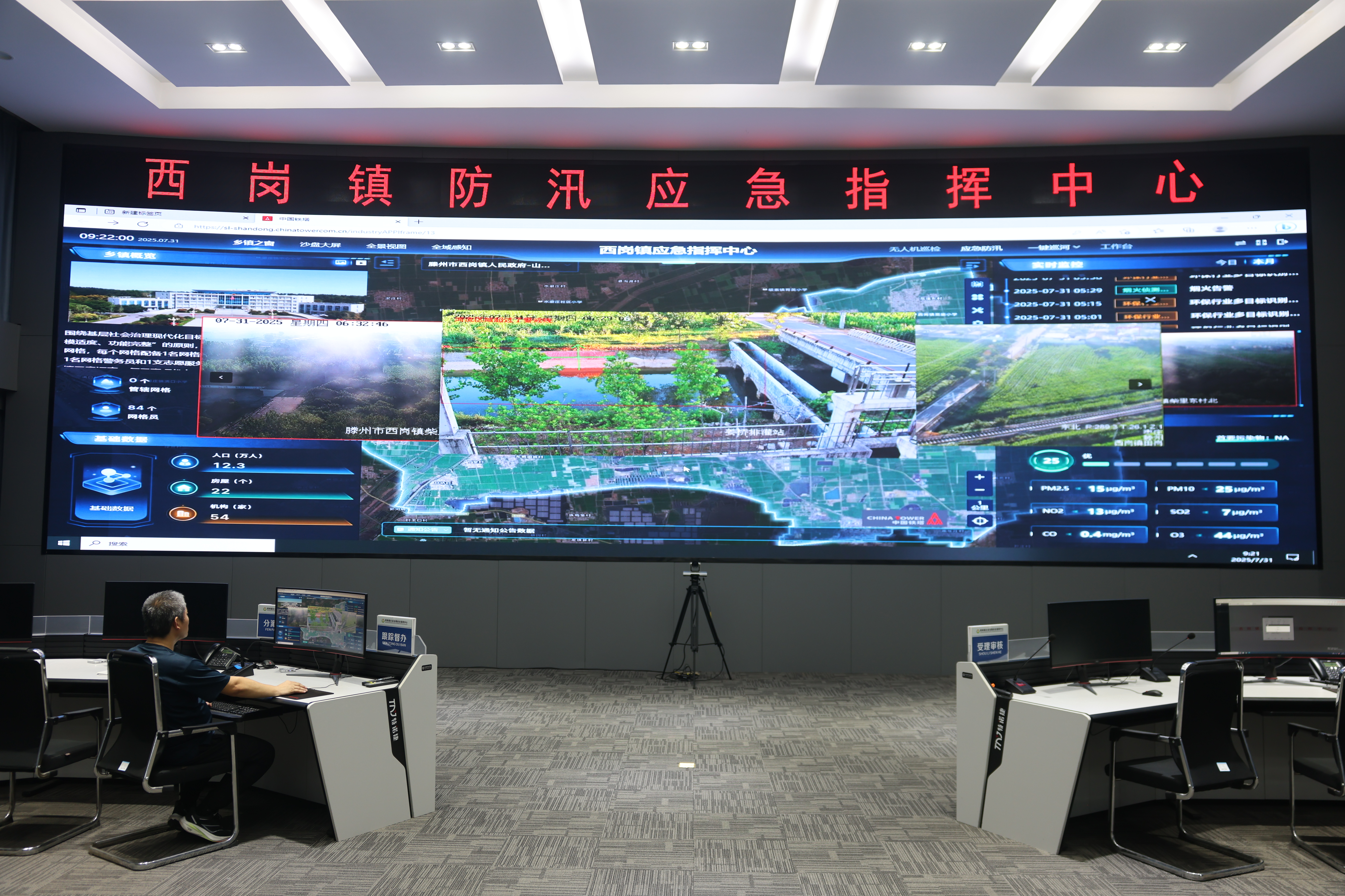 三是硬核协同区域联防。围绕“镇-总支-村居”三级联动体系,指挥中心创设了跨部门数据共享与各层级指令直达模式。在模拟城郭河滞洪区险情演练中,系统自动启动防汛应急预案,10分钟内完成群众转移路线规划、安置点资源调配与应急队伍集结,较传统防汛应急模式响应速度提升60%。同时,与周边乡镇建立信息互通平台,实现流域内及周边雨情、水情、汛情等各类数据实时共享。