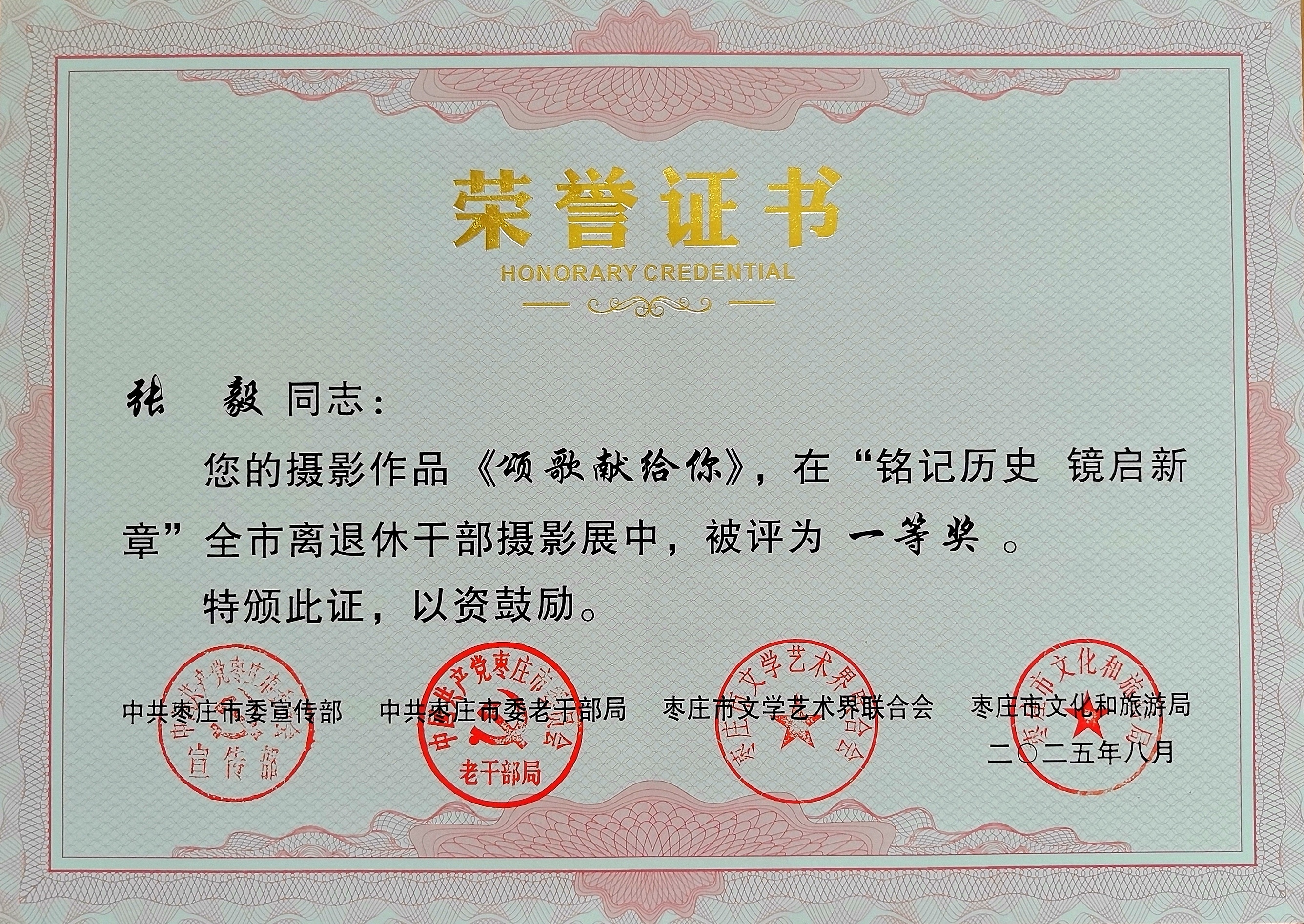 8月26日,“追忆历史铭初心 汲取力量启新程”全市离退休干部纪念中国人民抗日战争暨世界反法西斯战争胜利80周年书画摄影展在台儿庄大战纪念馆开展。滕州市城乡水务局老干部党支部张毅同志4幅摄影作品均入选,其中《颂歌献给你》荣获全市离退休干部纪念中国人民抗日战争暨世界反法西斯战争胜利80周年书画摄影展一等奖,《我们结婚啦》获优秀奖。