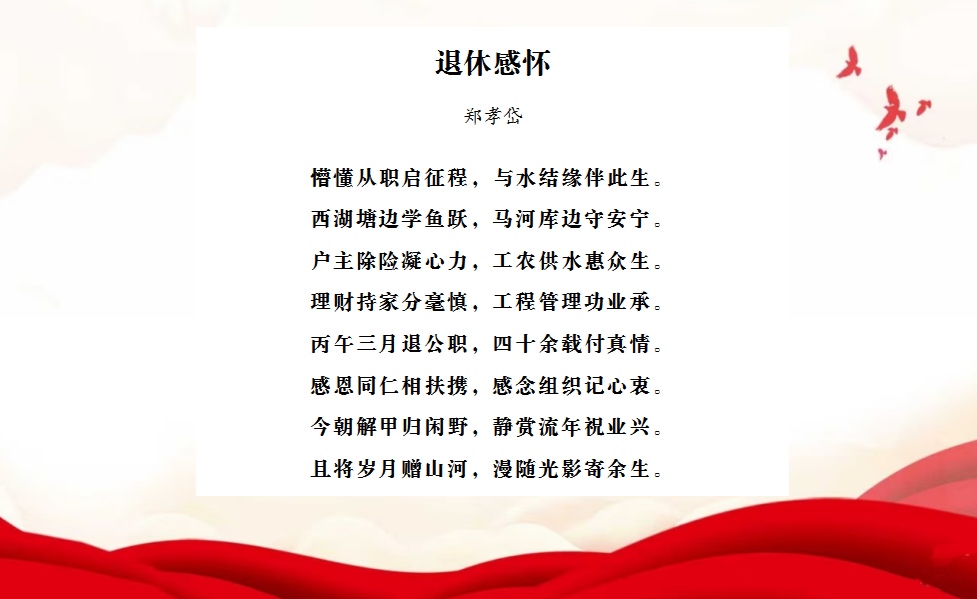 4月15日,市城乡水务局举行干部荣誉退休仪式,局党组书记、局长王学焱主持仪式并讲话,局党组班子成员、市南水北调工程建设管理服务中心科级干部及相关科室、中心人员参加仪式。市南水北调工程建设管理服务中心原七级职员郑孝岱同志光荣退休。