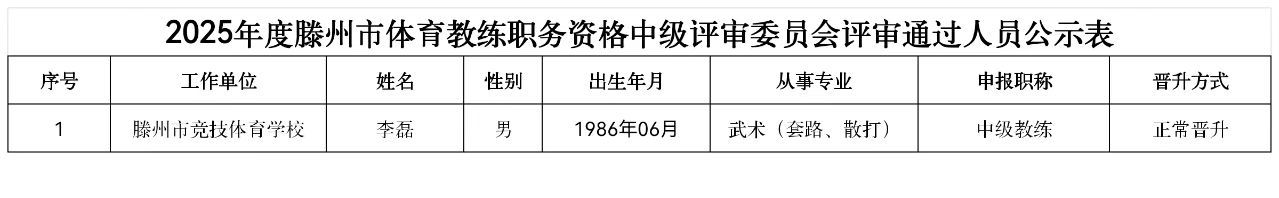 关于对2025年度滕州市体育教练职务资格中级评审委员会评审通过人员进行公示的公告