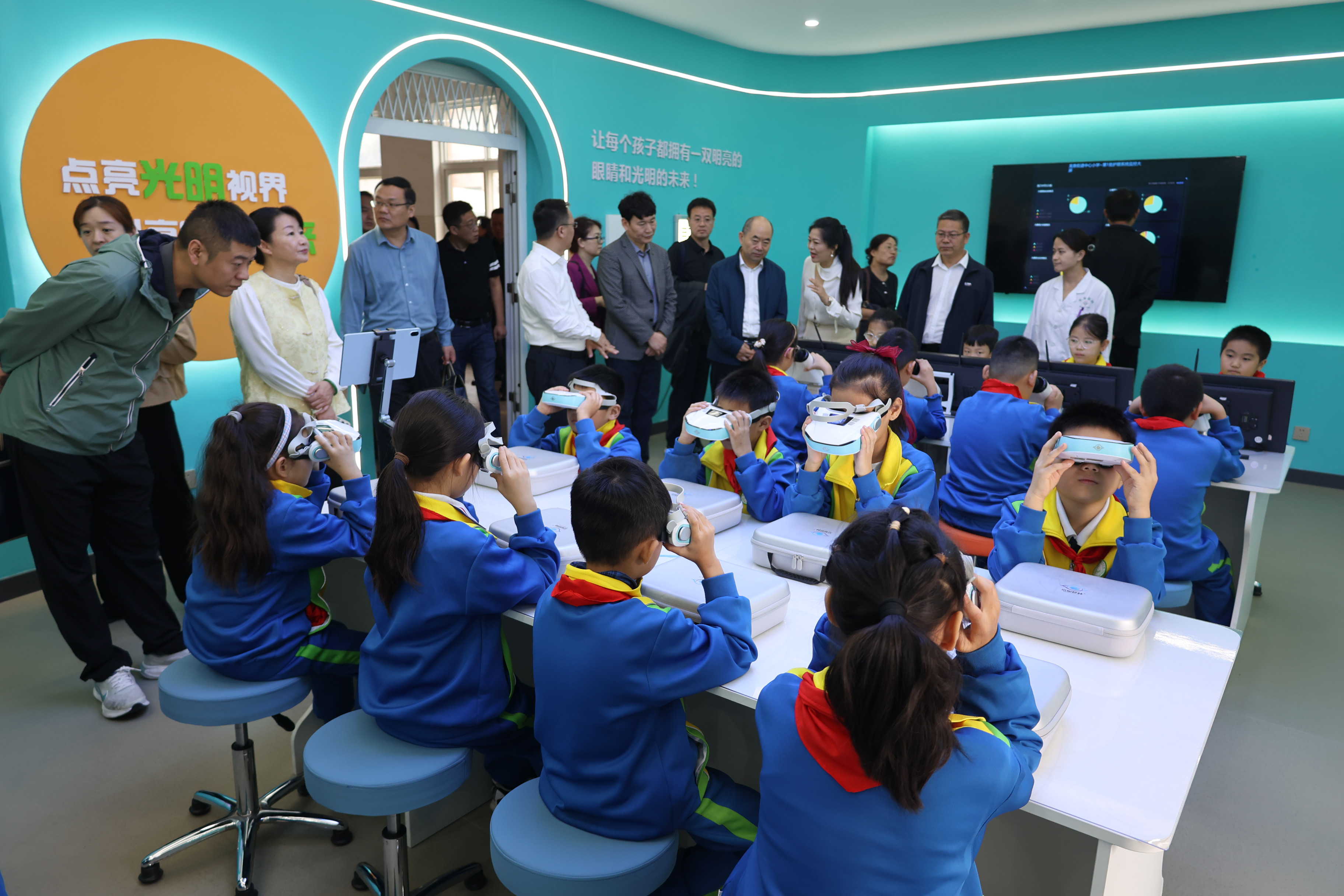 现场观摩环节,参会人员先后走进龙泉街道中心幼儿园和中心小学。龙泉街道中心幼儿园打造了“爱眼护眼游戏天地”,将护眼知识融入户外沙水游戏、护眼情景剧、体能活动中;在“瞳护光明 看见美好”主题展区,小小解说员现场分享近视防控作品创作理念。龙泉街道中心小学则展演了眼保健操、创意桌面操和“视力保护”运动项目,并通过“校长光明未来工作室”的近视率图表与护眼实物,直观呈现了“抓早抓小”的近视防控理念。