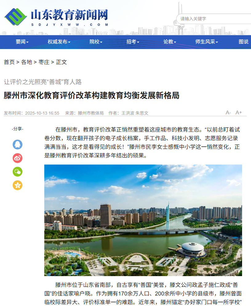 10月13日,山东教育新闻网以《滕州市深化教育评价改革构建教育均衡发展新格局》为题,深度解读“一套评价体系如何引发我市‘小城大教育’的生态之变”,引发广泛关注。