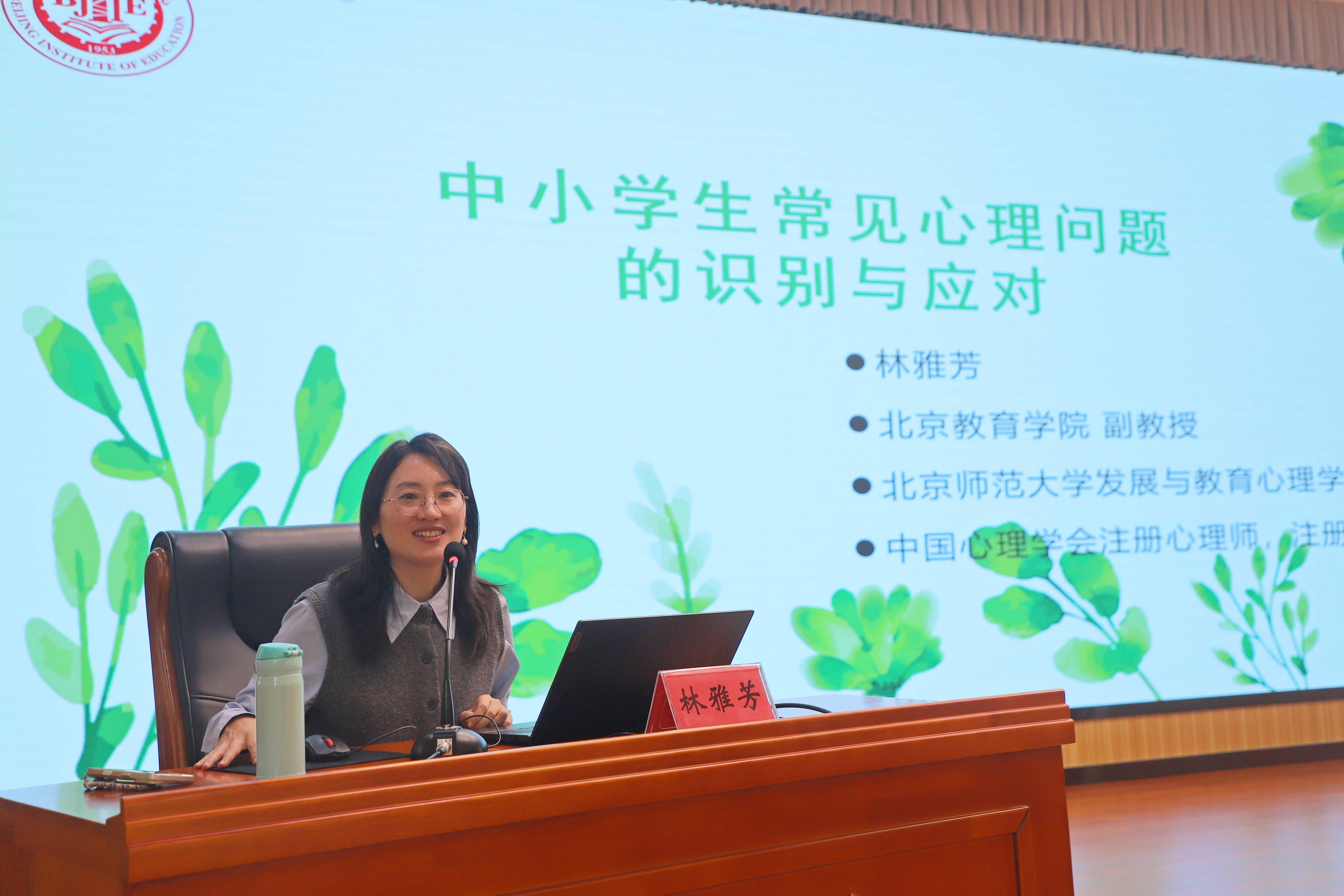 北京教育学院副教授、北京师范大学发展与教育心理学博士林雅芳结合丰富的心理干预工作经验,作题为《中小学生常见心理问题的识别与应对》的专题报告。报告内容丰富,从心理问题识别及应对的必要性、如何正确识别、如何有效应对三个方面,为参训人员提供了应对学生心理问题的方法路径。