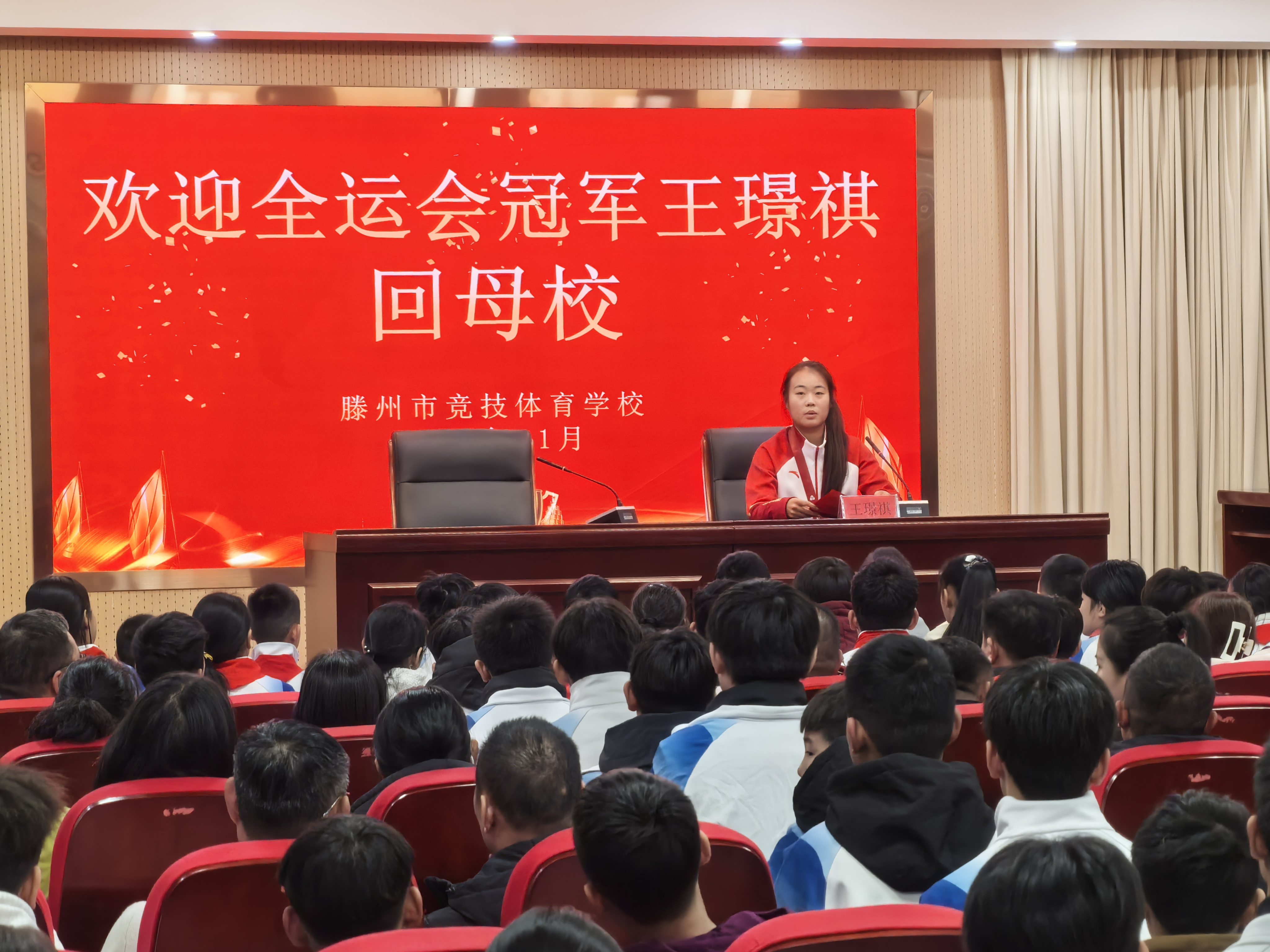 在随后举行的专题报告会上,王璟祺深情回顾了在市竞技体校的成长经历,分享了从启蒙训练到全运夺冠的奋斗历程,生动讲述了面对挑战、克服困难、不断突破的感人故事。她特别感谢父母的养育之恩、母校的培育之情以及教练的悉心指导,并勉励学弟学妹坚定理想信念、勇于追逐梦想,以不懈奋斗书写青春华章。整场报告会气氛热烈、掌声不断,师生深受激励。