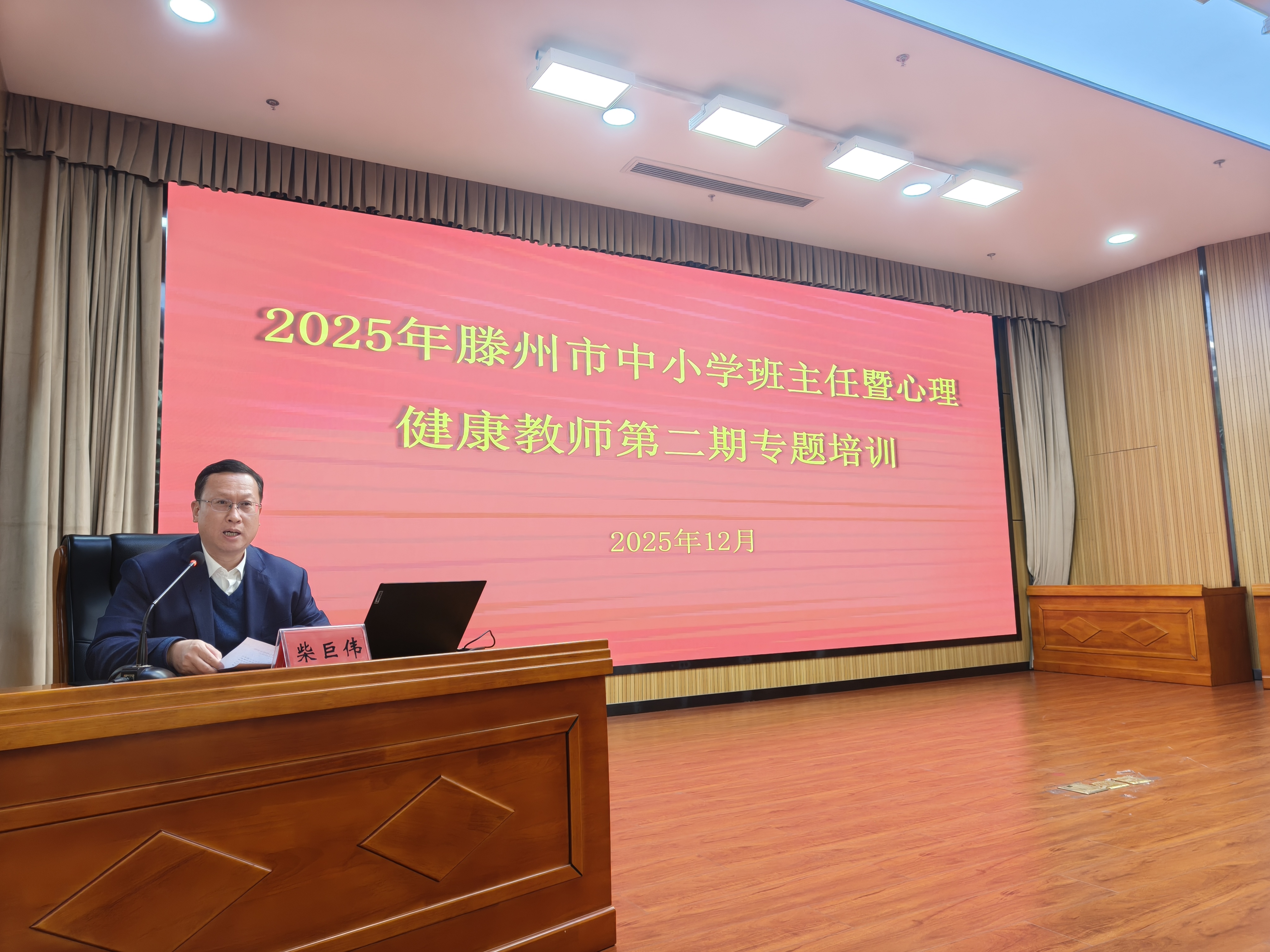12月11日,滕州市中小学班主任暨心理健康教师2025年第二期专题培训成功举办,市教育体育局党组成员、副局长柴巨伟主持活动。