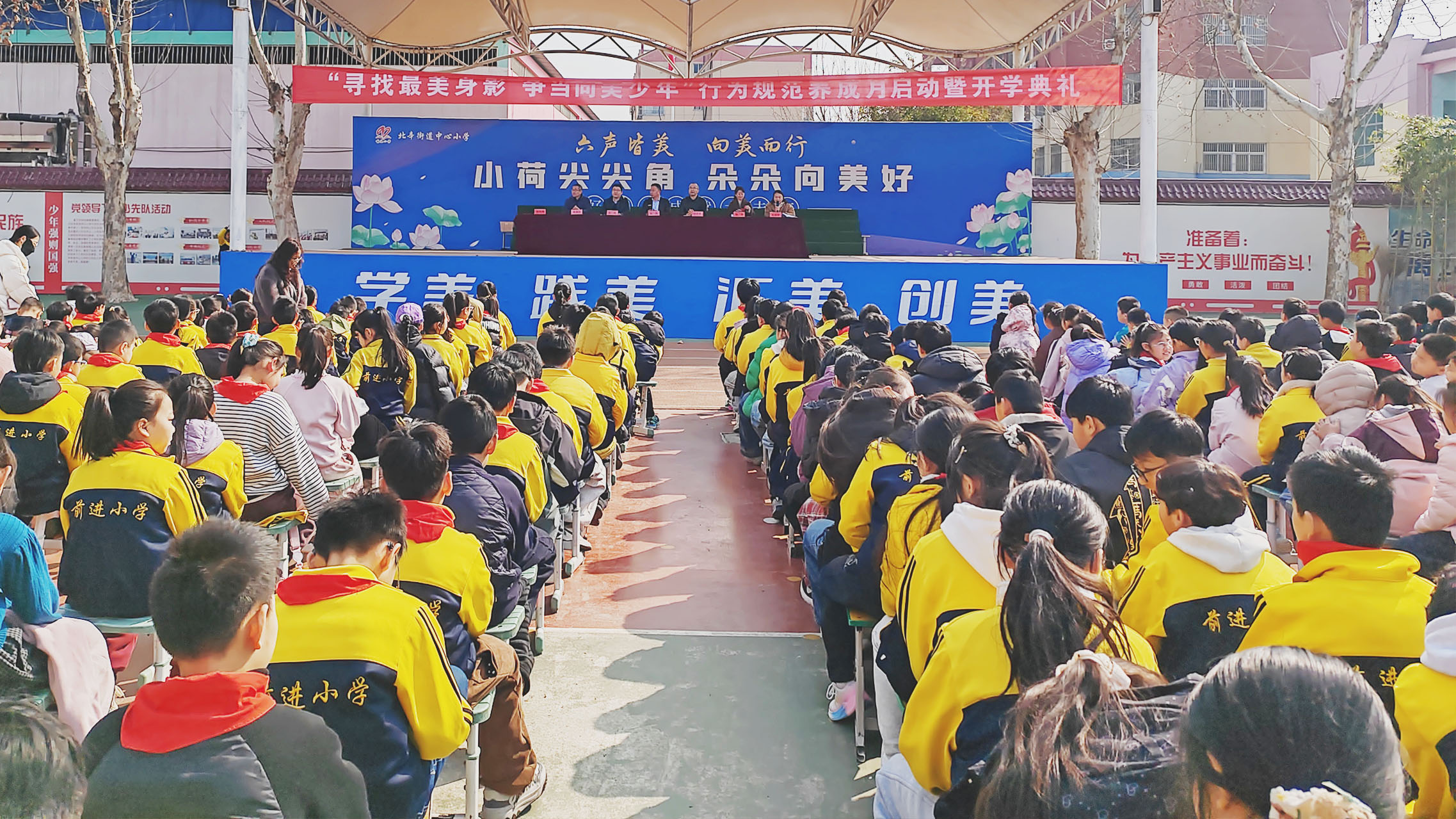 庄严启动,吹响规范集结号角。 北辛街道中心小学举行“春季开学典礼暨行为规范养成月”启动仪式。升旗仪式上,全体师生肃立行礼,在雄壮国歌声中厚植爱国情怀;优秀学生依次登台接受表彰,成为操场上最亮眼的风景;学生代表许下“向美而行”的青春承诺。从庄严升旗到集体宣誓,整场活动环环相扣,激励全体师生在规范中涵养品格,在奋斗中追求卓越。