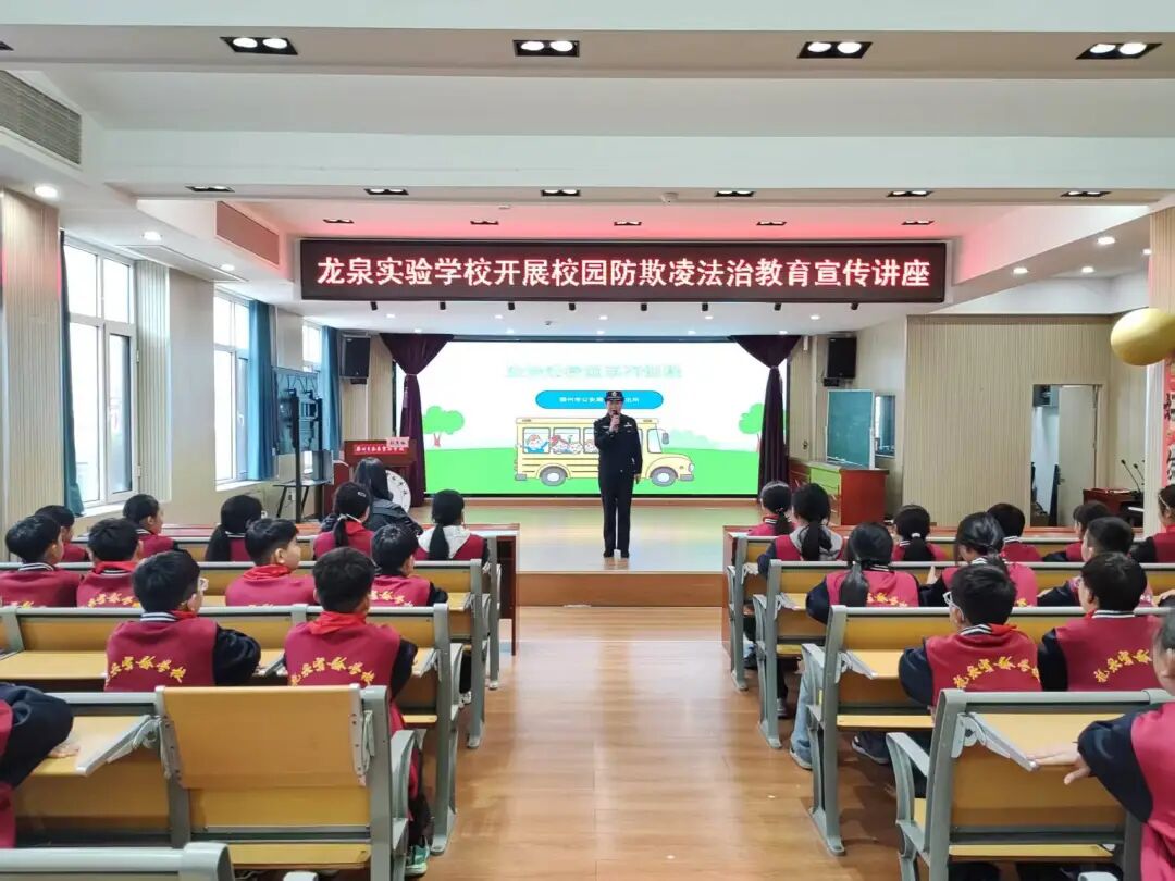 法治讲座,普法知识融入课堂。龙泉实验学校邀请公安交警进校园,围绕防欺凌、交通安全等法律法规,结合青少年认知特点,用真实案例和现场模拟形式,深入浅出地讲解了具体做法。