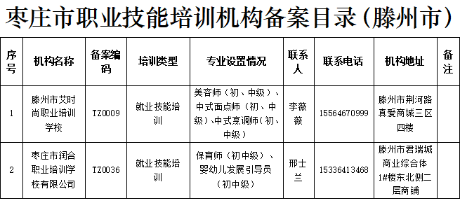 根据《山东省人力资源和社会保障厅 山东省财政厅关于规范补贴性职业技能培训目录和补贴标准的通知》和市人力资源社会保障局《关于做好职业技能培训机构备案管理的通知》、《枣庄市补贴性职业技能培训机构目录管理实施细则》(枣人社函〔2025〕44号)要求,经培训机构提出申请,滕州市公共就业和人才服务中心初审、实地复审,拟新增滕州市艾时尚职业培训学校、枣庄市润合职业培训学校有限公司2家补贴性职业技能培训机构,现将情况予以公示。
