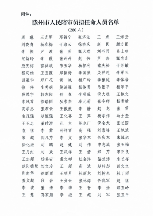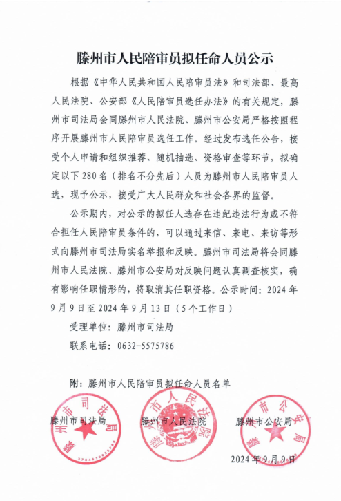 根据《中华人民共和国人民陪审员法》和司法部、最高人民法院、公安部《人民陪审员选任办法》的有关规定,滕州市司法局会同滕州市人民法院、滕州市公安局经过发布选任公告,接受个人申请和组织推荐、随机抽选、资格审查等环节,确定了280名滕州市人民陪审员人选,并发布了《滕州市人民陪审员拟任命人员公示》,接受广大人民群众和社会各界监督。