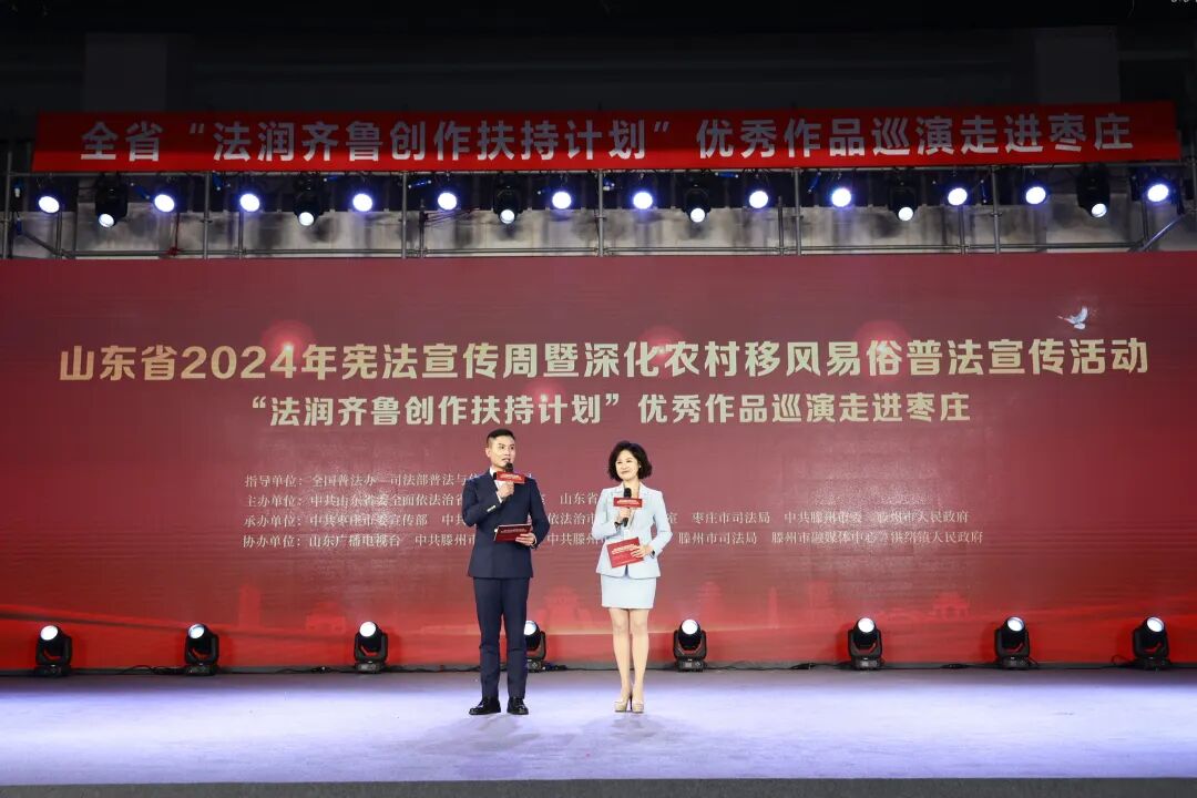 12月4日,山东省2024年宪法宣传周暨深化农村移风易俗普法宣传活动—“法润齐鲁创作扶持计划”优秀作品巡演走进枣庄活动在滕举行。司法部普法与依法治理局普法宣传处处长蒋英林,山东省司法厅副厅长、省戒毒管理局局长刘振远等出席活动并致辞。枣庄市委常委、宣传部部长陈永生,枣庄市民政局局长王洪燕,枣庄市司法局局长孙守春,滕州市委常委、宣传部部长康凤霞,滕州市政府副市长、市公安局局长李建峰,滕州市司法局局长吕卫民参加活动。